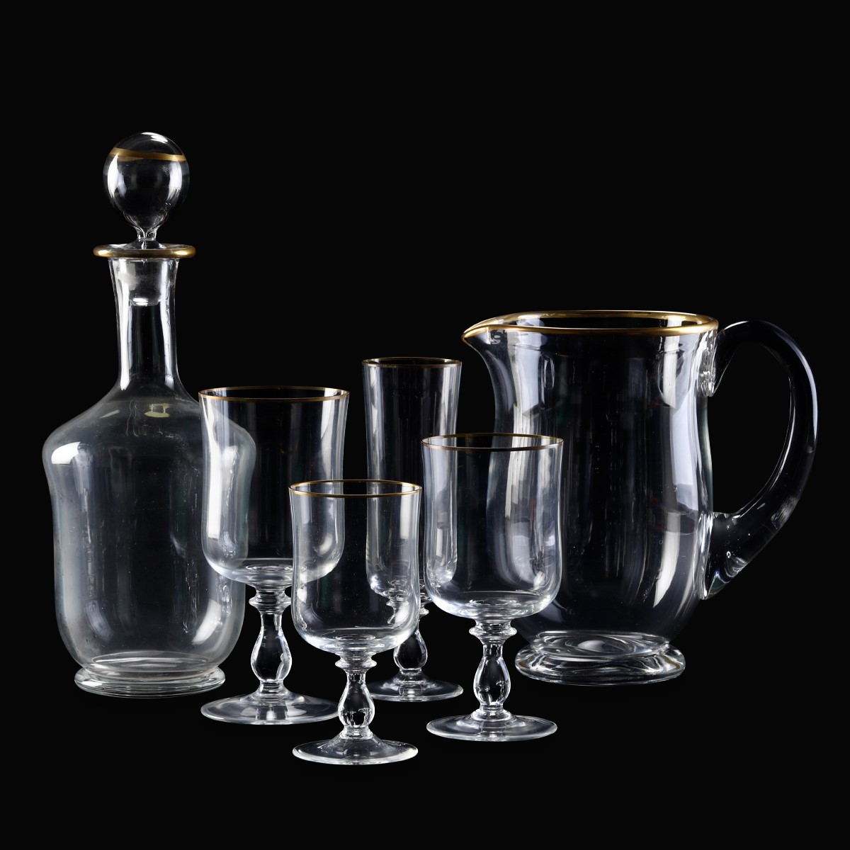 Il servizio per 11 persone più riserve, conta 48 pezzi ed è così composto: 11 calici da acqua (altezza cm 16); 12 calici da vino rosso (altezza cm 14,5); 12 calici da vino bianco (altezza cm 13,2); 11 flûtes (altezza cm 17,5); 1 brocca (altezza cm 19,5); 1 bottiglia con tappo (altezza cm 30,5).