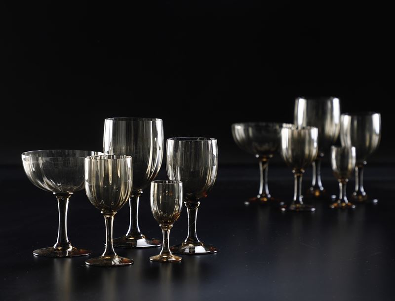 Crsitallo color fumé. Marca: “Daum Nancy” inciso all’acido. Conservazione: ottima; una lieve felatura su una coppa e un’insignificante sbeccatura su un calice da vino