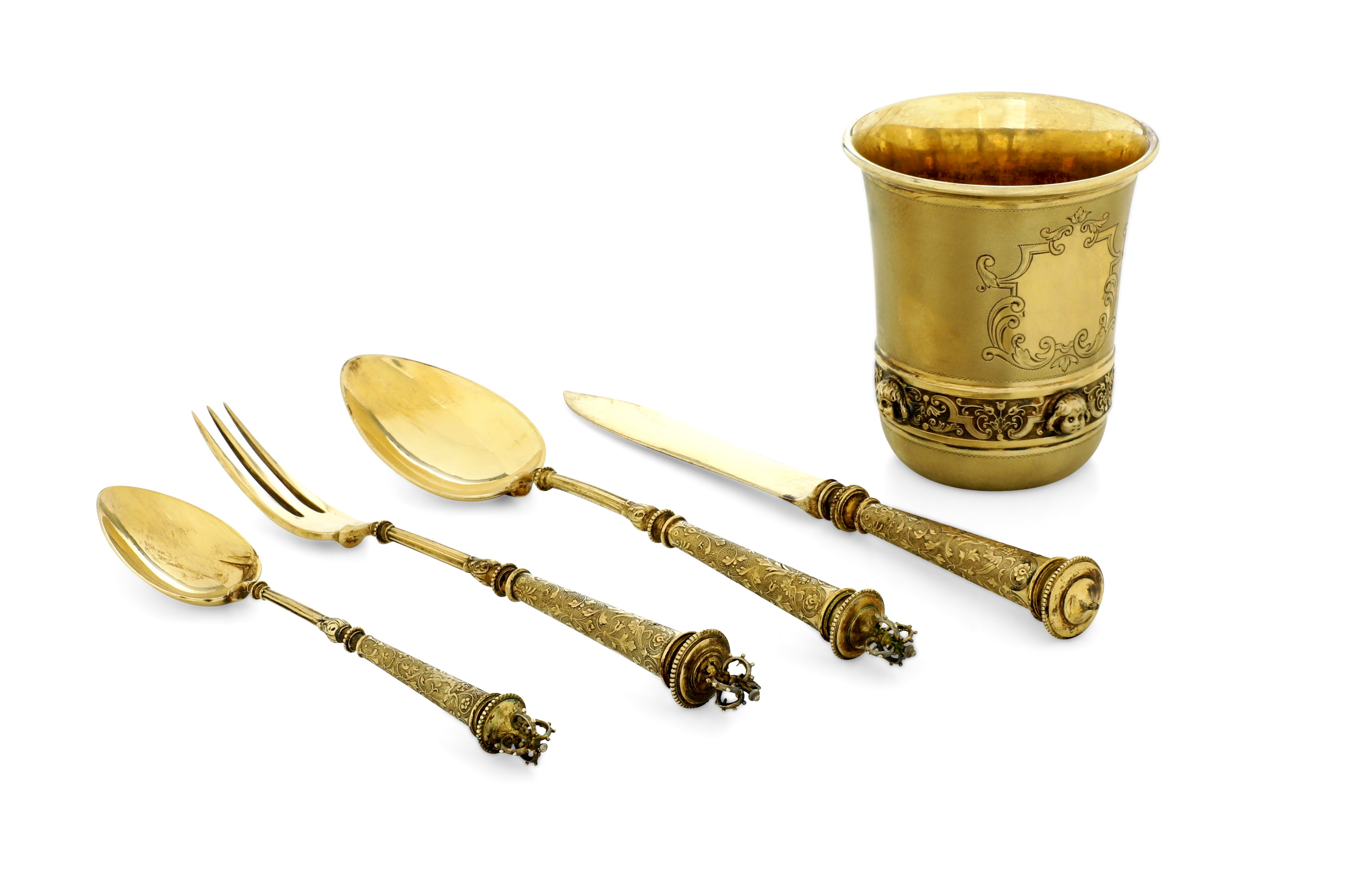 Set di posate e bicchiere in argento vermeille, L. Janesich