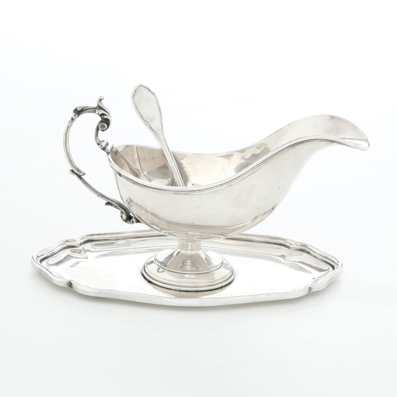 Salsiera con vassoio e cucchiaio. Argenteria veneta del XX secolo, argentiere Rino Greggio, Padova