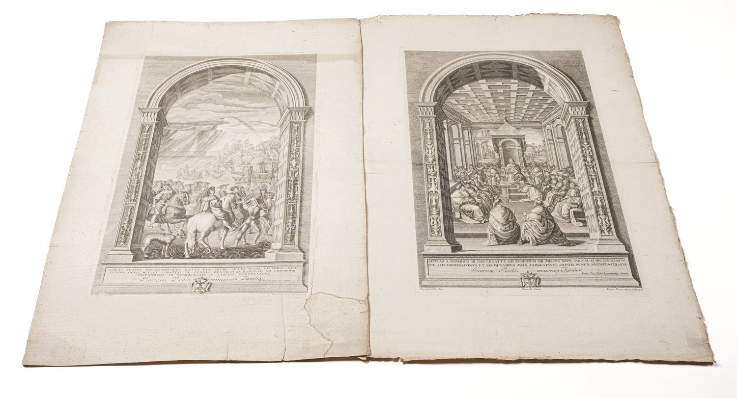 Quattro grandi tavole incise in rame riproducenti celebri opere pittoriche del genio urbinate. Dimensioni: 49cm x 76cm ca.