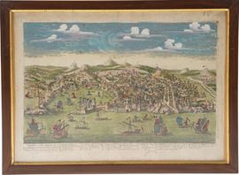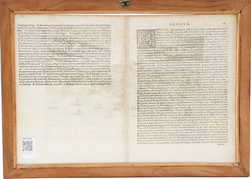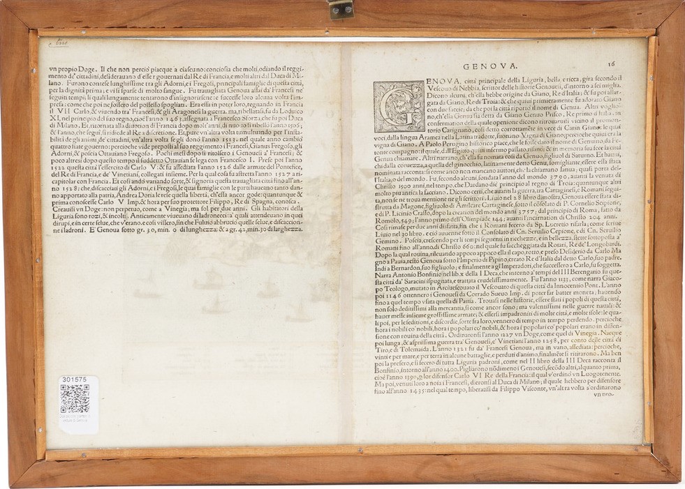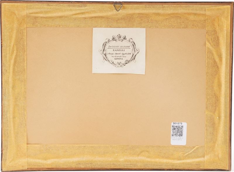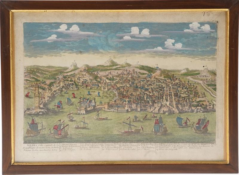 Due piacevoli immagini della città di Genova vista dal mare in piacevole coloritura. Cartigli esplicativi nella parte bassa delle due stampe. Al verso di una delle due vi si legge una descrizione parziale della sua storia