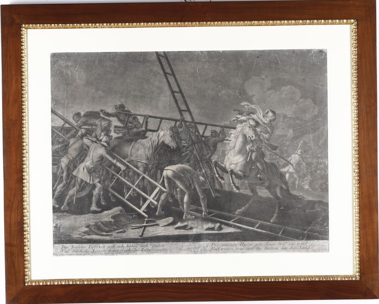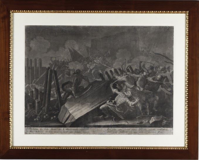 Lotto di 2 incisioni con scene a tema bellico. Entro belle cornice in legno