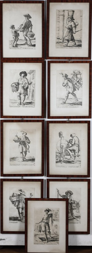 Nove incisioni incorniciate e due sciolte. Tiratura del secolo XX. Proposte come stampe decorative.