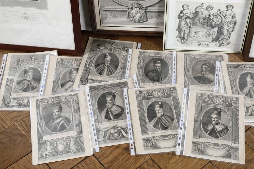 Celebre pianta xilografica di Venezia, proveniente da una edizione della Cosmografia del Munster. Entro cornice in legno. Si aggiungono nel lotto: Hieronymus Wierix, San Marco. Incisione originale a bulino tratto dalla serie dei 4 evangelisti, frontespizio del tomo I del Nouveau theatre d' Italie e altre 5 incisioni in cornice. Aggiungiamo ancora, sciolte una serie di 13 incisioni raffiguranti dogi della repubblica di Venezia.