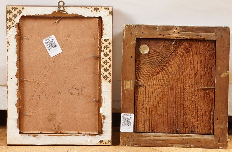 Due piccoli dipinti con parti ricamate, XIX secolo raffiguranti scene sacre. Uno cm 22x15 l'altro cm 18x15