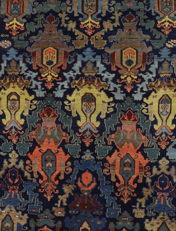 campo blu scuro con due ampi medaglioni esagonali circondati da figure ed animali. Bordura albicocca con triangoli uncinati.