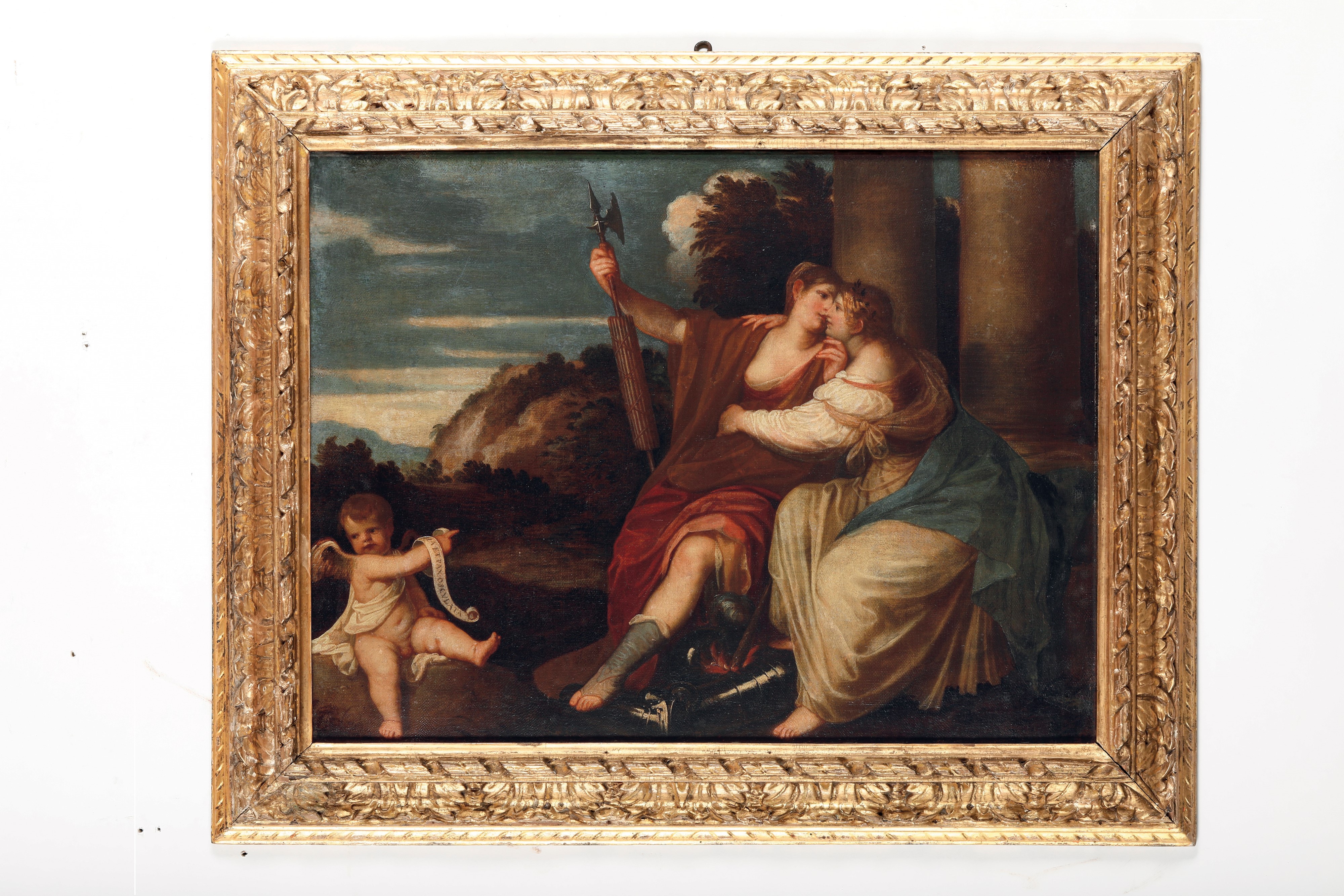 Appartenuto in seguito alla collezione Pelliccioli, secondo una nota redatta a tergo di una fotografia di proprietà del Kunsthistorisches Institut di Firenze, il dipinto è stato considerato come opera tarda del Padovanino, datato al quinto decennio del diciassettesimo secolo ed erroneamente riconosciuto come una raffigurazione della Vittoria e la Pace (Ruggeri, 1988, p. 118).