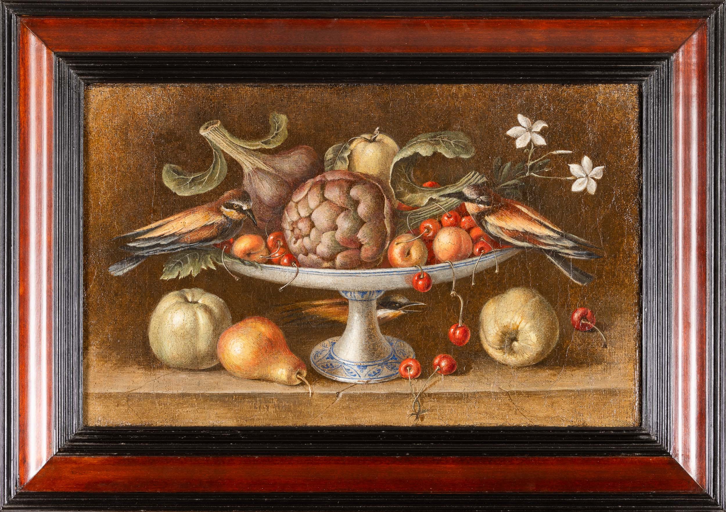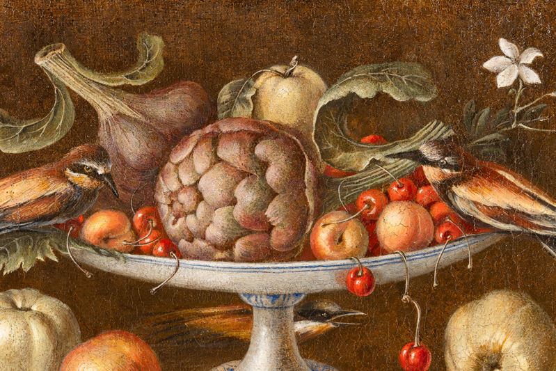 La presenza dei tre gruccioni, particolare specie di passeraceo, risulta essere una cifra stilistica caratteristica della produzione di nature morte di Orsola Maddalena Caccia, come testimonia l'opera del comune di Moncalvo, prima opera dell'artista di questo genere.