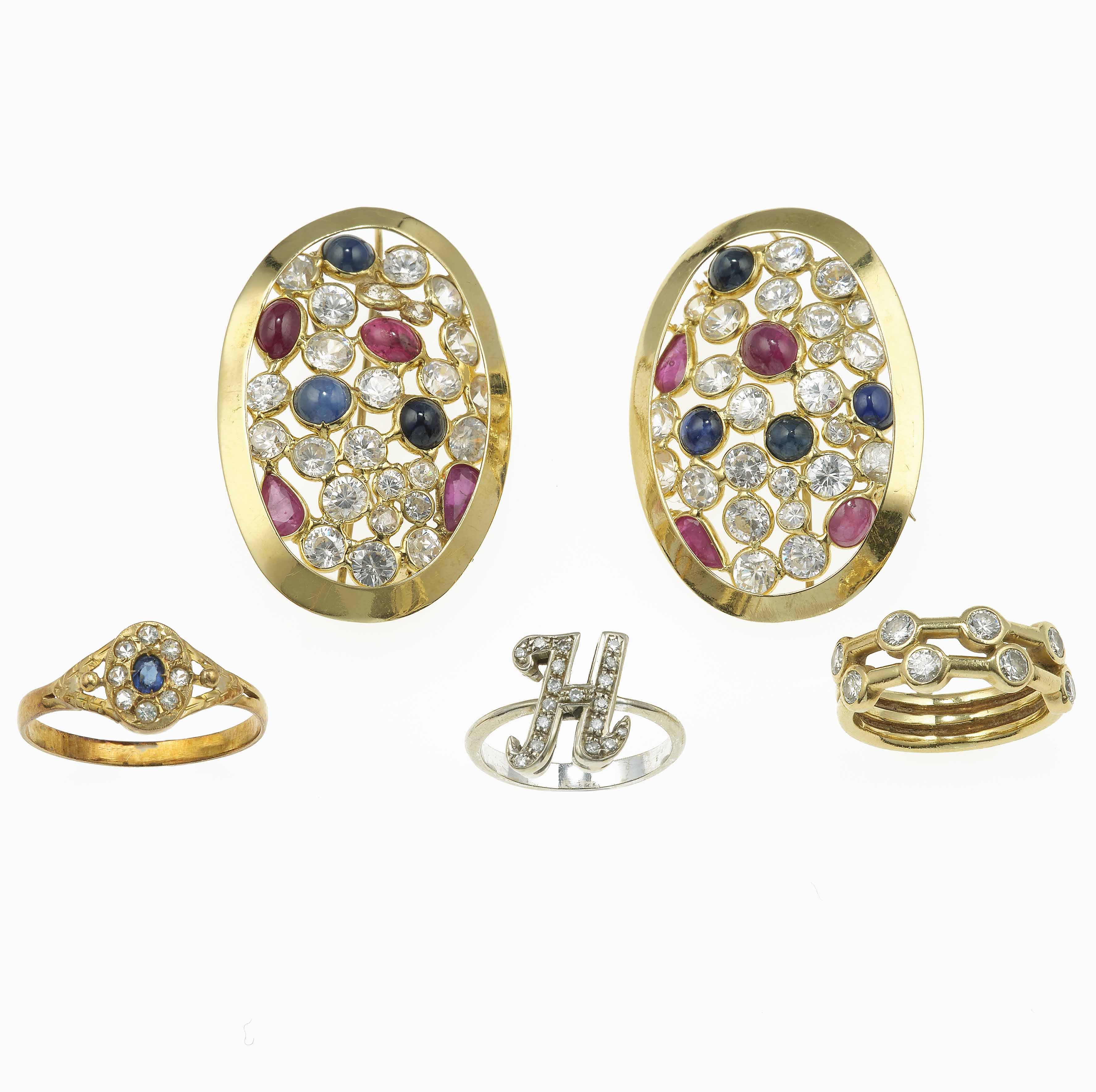 Lotto composto da una coppia di spille/pendenti e tre anelli con imitazioni di diamanti e corindoni rossi e blu