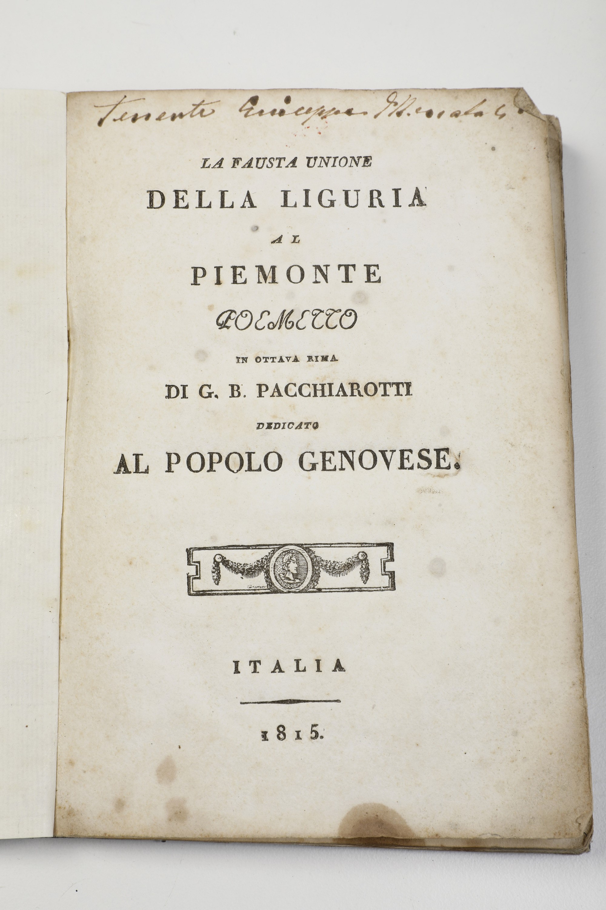 3) G.B. Pacchiarotti La fausta unione della Liguria al Piemonte Poemetto in ottava rima .. dedicato al popolo genovese s.e. Italia 1815