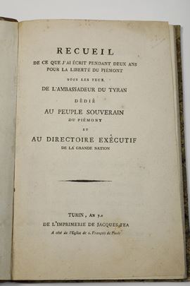 2) Auguste Hus Recueil de ce que j'ai ecrit pendant deux ans pour la liberte du Piemont... Turin An 7° (1799)