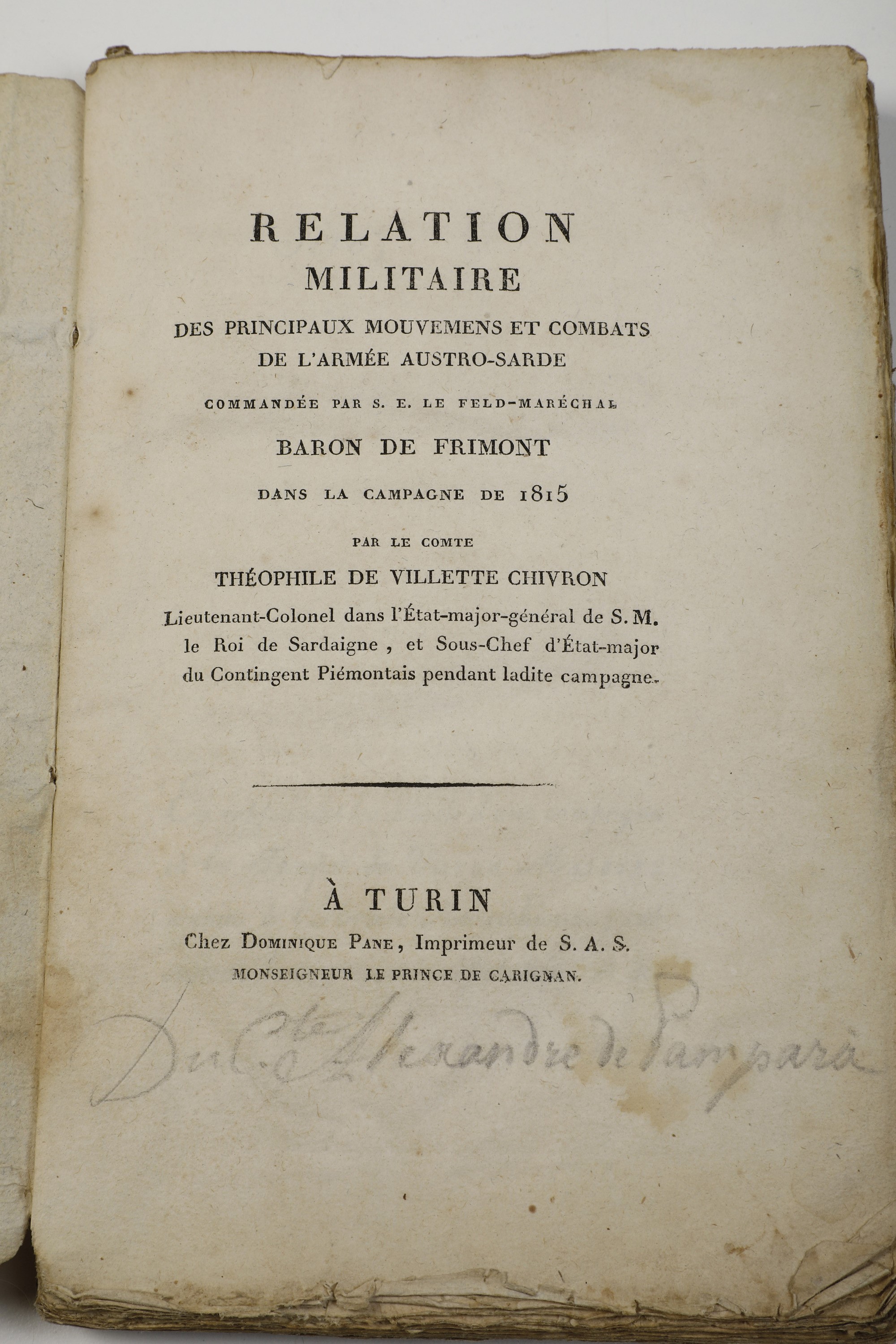 4) Theophile De Villette Chivron Relation militaire des principaux mouvemens et combats de l'Armee Austro-Sarde commandee....Turin (1815)