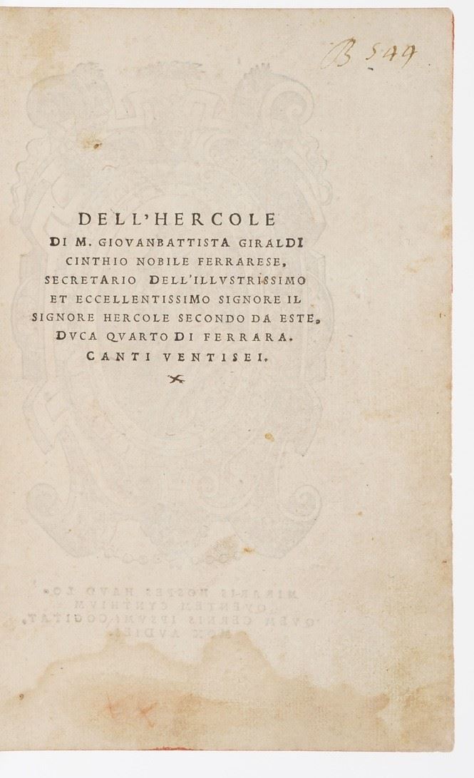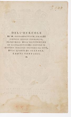 Cinthio Giraldi Giovan Battista. Dell'Hercole... canti 26... in Modena, nella stamperia De Gadaldini 1557.