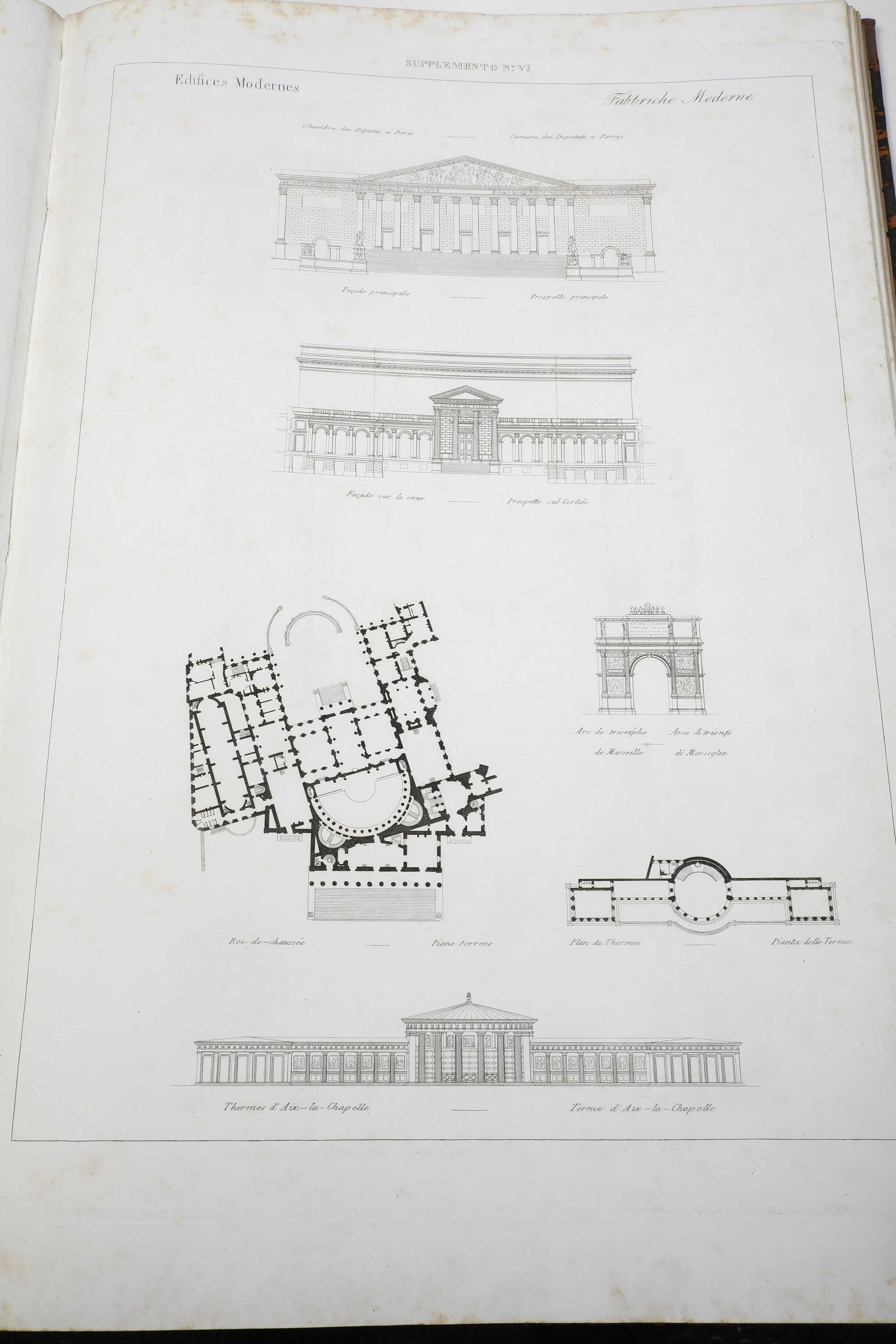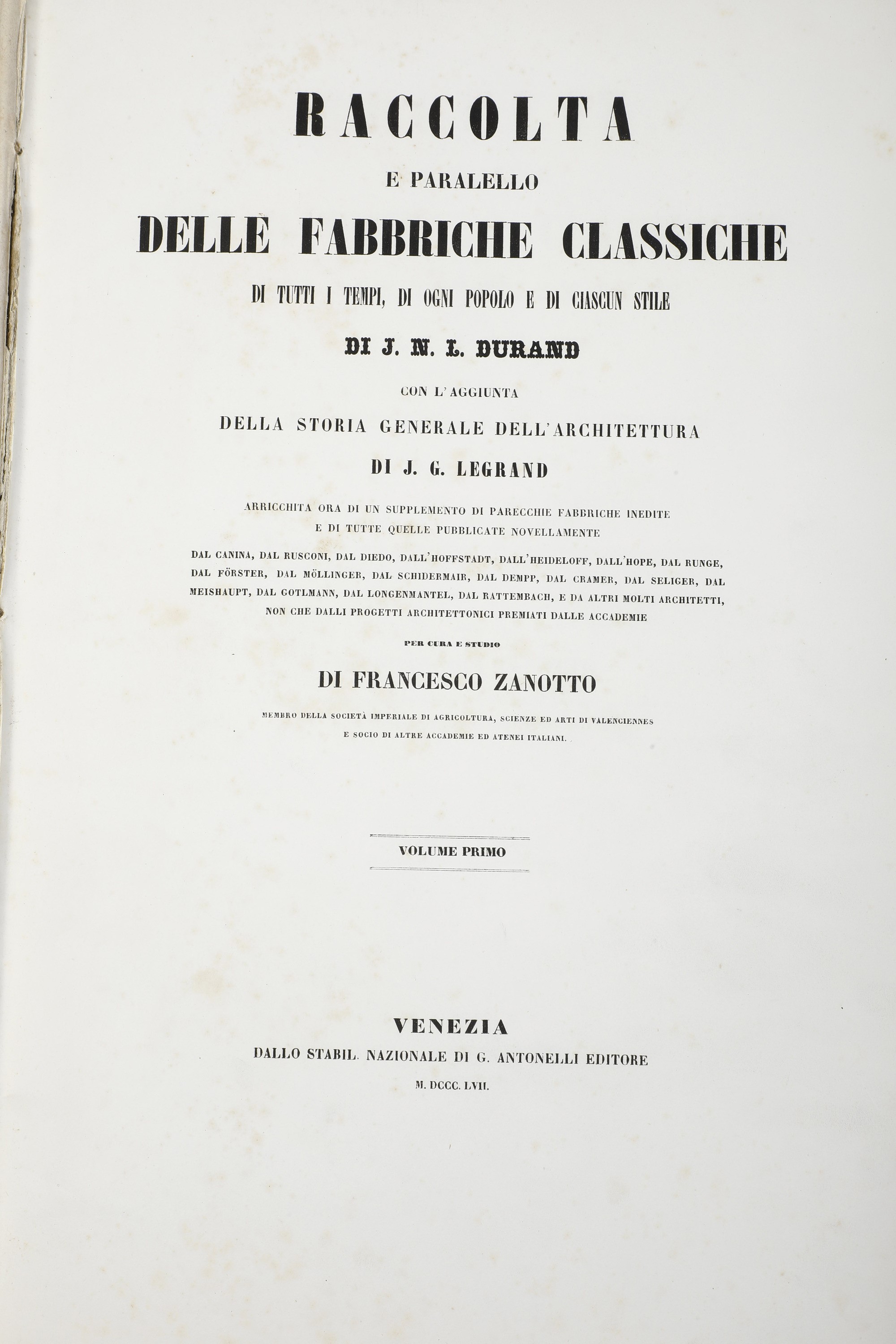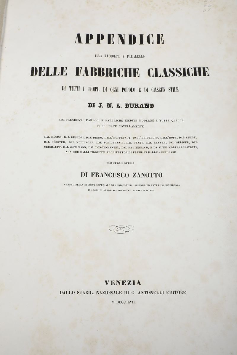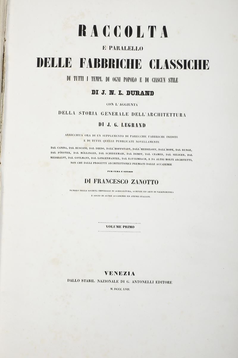 Jean Nicolas Louis Durand Raccolta e Parallelo delle Fabbriche Classiche di tutti i tempi d’ogni popolo e di ciascun stile con l’aggiunta della storia generale dell’architettura di J.G.Legrand arricchita ora di un supplemento di parecchie fabbriche inedite e di tutte quelle pubblicate novellamente dal Canina, dal Rusconi, dall’Hoffstadt etc. ….. e da molti architetti non che dalli progetti architettonici premiati dalle Accademie per cura e studio di Francesco Zanotto