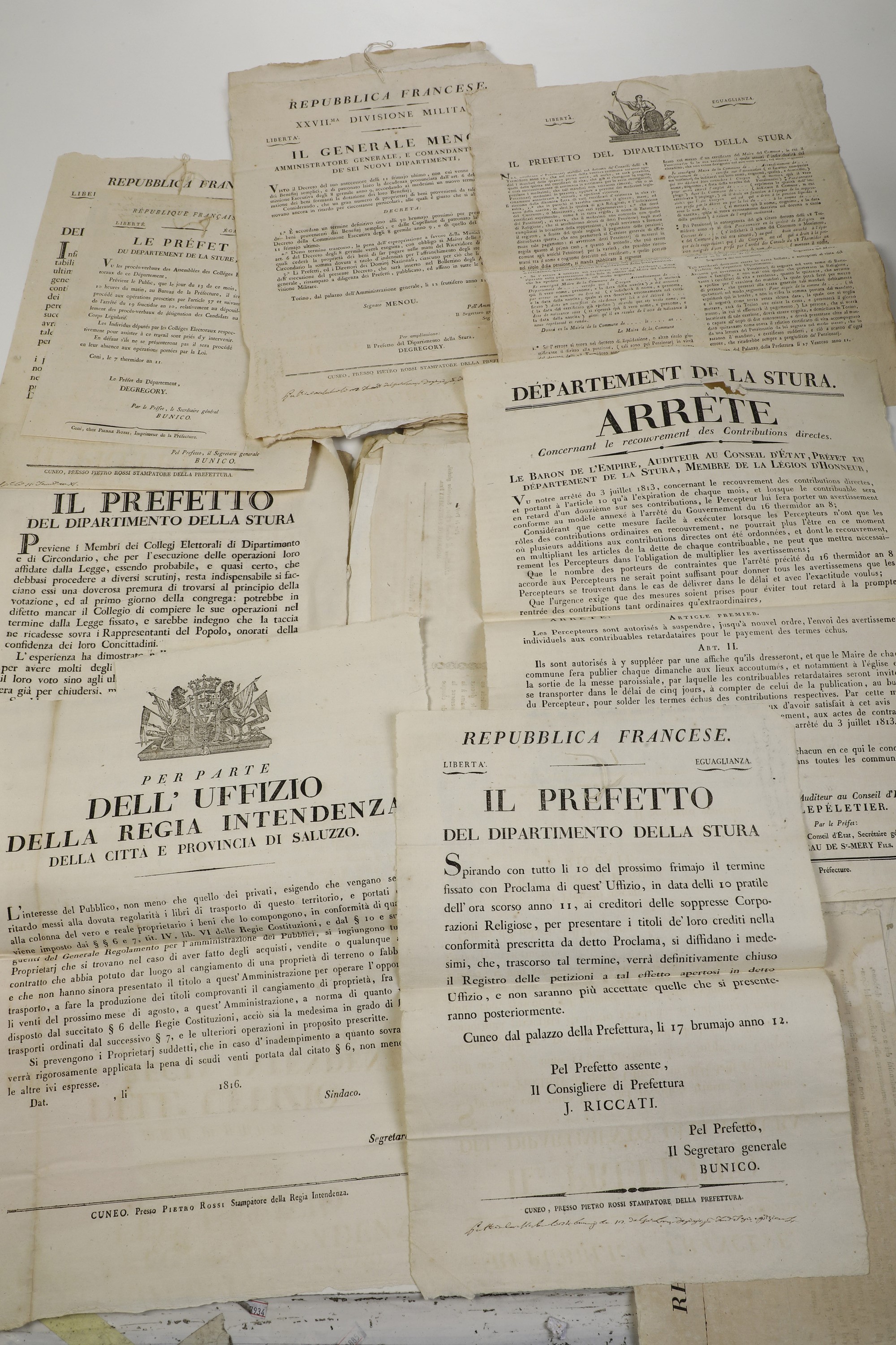 Collezione di 67 manifesti del periodo napoleonico Dipartimento della Stura dal 1802-1814. Editti, proclami, sentenze, decreti in formato diverso su carta forte in barbe; la maggior parte stampati a Cuneo presso Pietro Rossi in buon stato di conservazione.