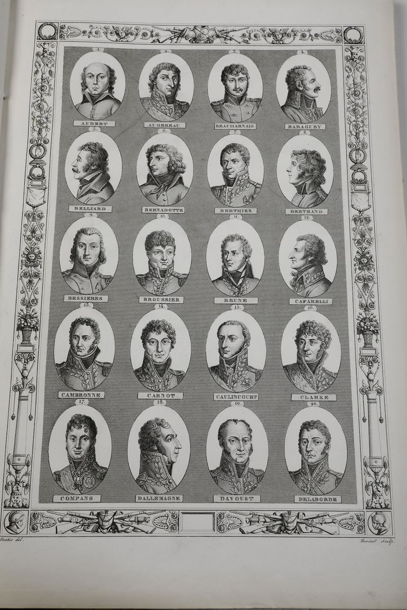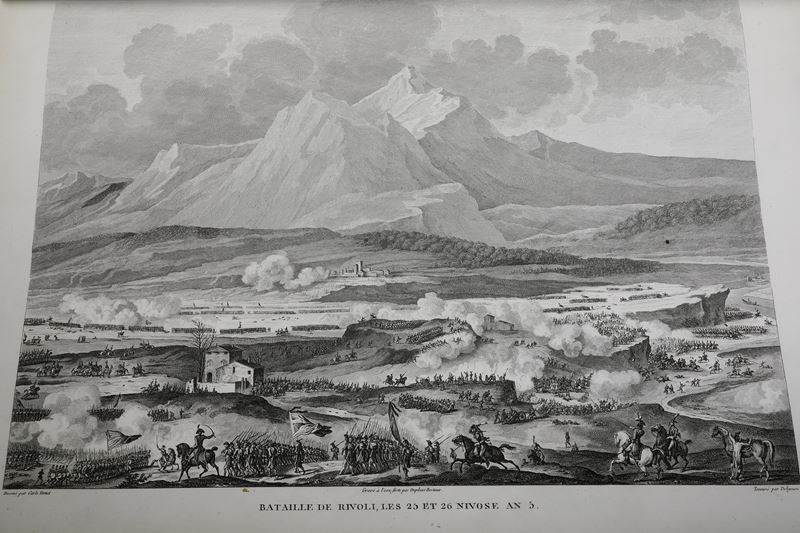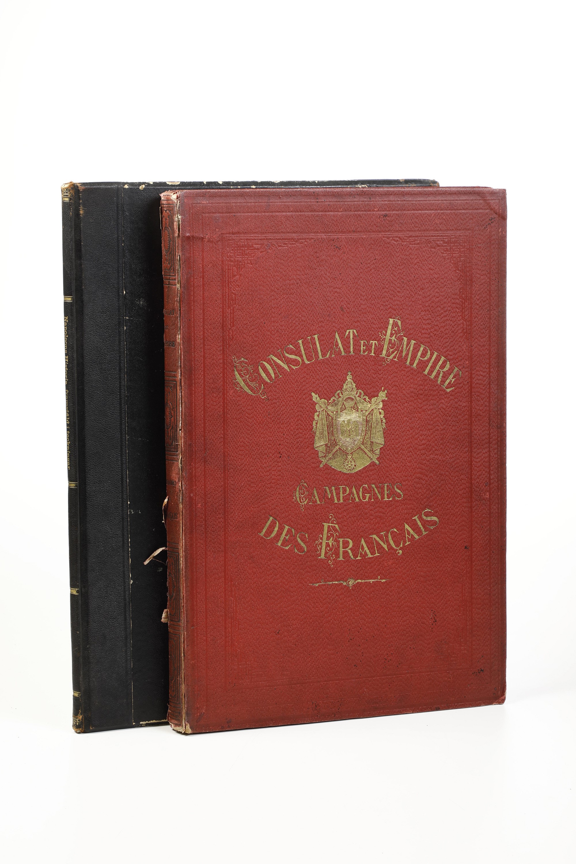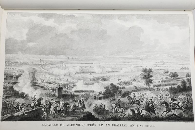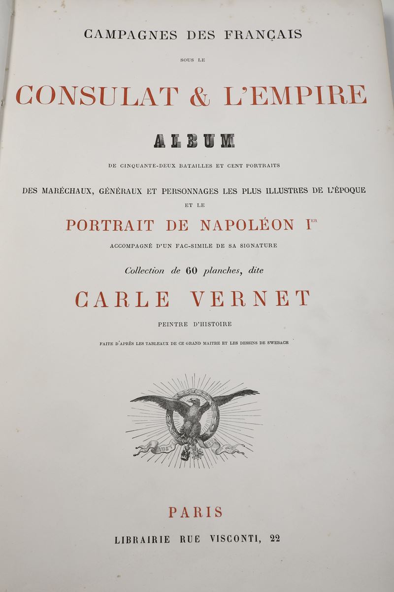 2) Carle Vernet Campagnes des Francais sous le CONSULAT & L'EMPIRE Album de cinquante-deux batailles et cent portraits des generaux….. collection de 60 planches Libraire rue Visconti Paris s.d. ( metà sec. XIX) Album in folio cm. 48x32 legatura in percallina rossa con scritte e armi imperiali in oro al piatto, dorso con incisioni a secco, cerniere fessurate cuffie e angoli usurate ma buon esemplare, con tavv. nitide e ben inchiostrate.