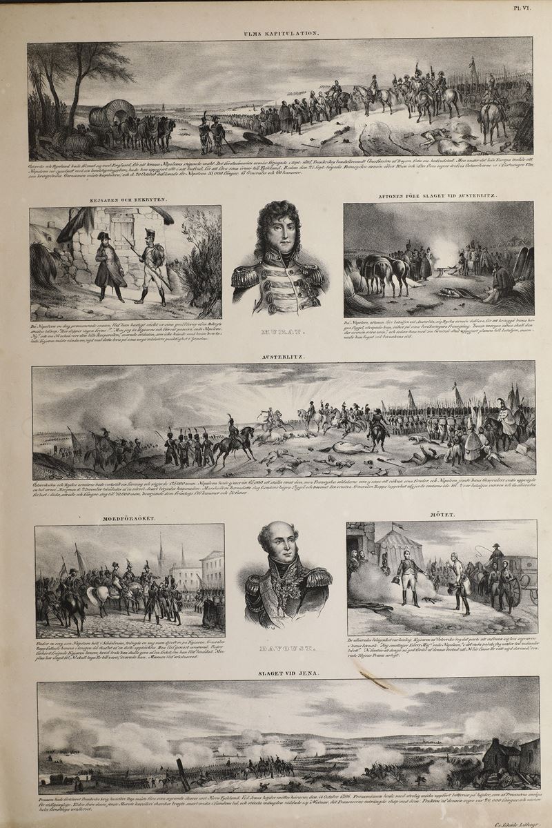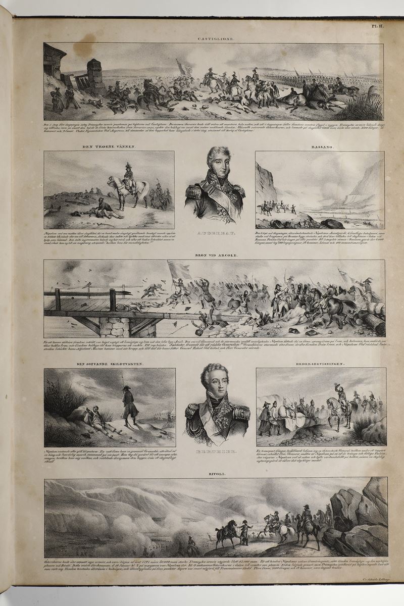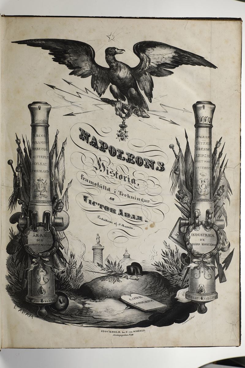 Titoli: 1) Victor Adam Napoleons Historia framstalld i Tekningar C. von Scheele Stockolm s.d. (prima metà sec XIX) Album in folio cm. 48,5x35 frontespizio litogr. + 12 tavv litogr. della vita e gesta di Napoleone Lingua svedese Legatura mz pelle con angoli scritte e fregi in oro al dorso piatti in percallina alcune tavv. con restauri.