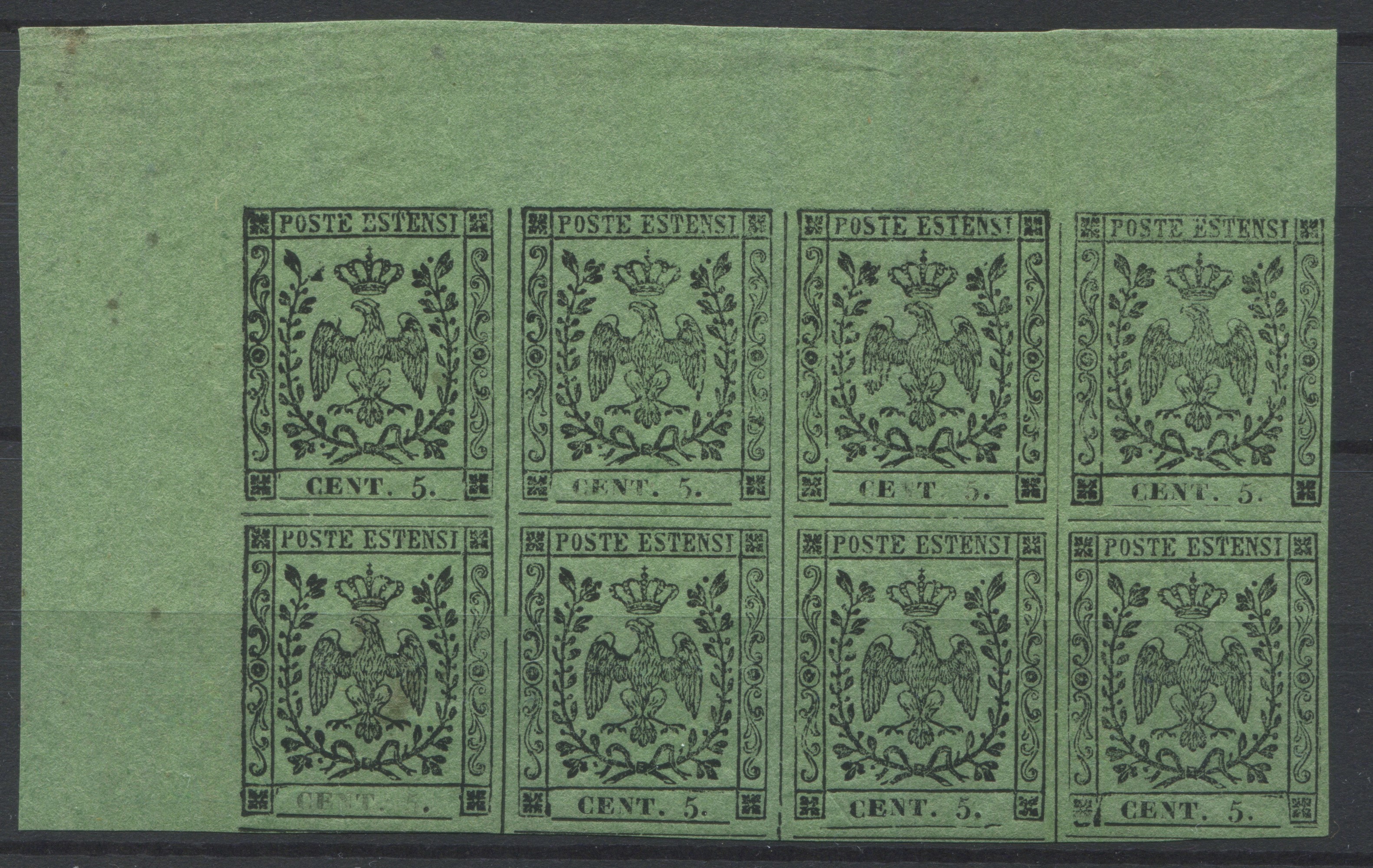 1855 - Ducato di Modena - Blocco di otto esemplari, margine di foglio superiore sinistro, del 5c. verde oliva con punto [..]