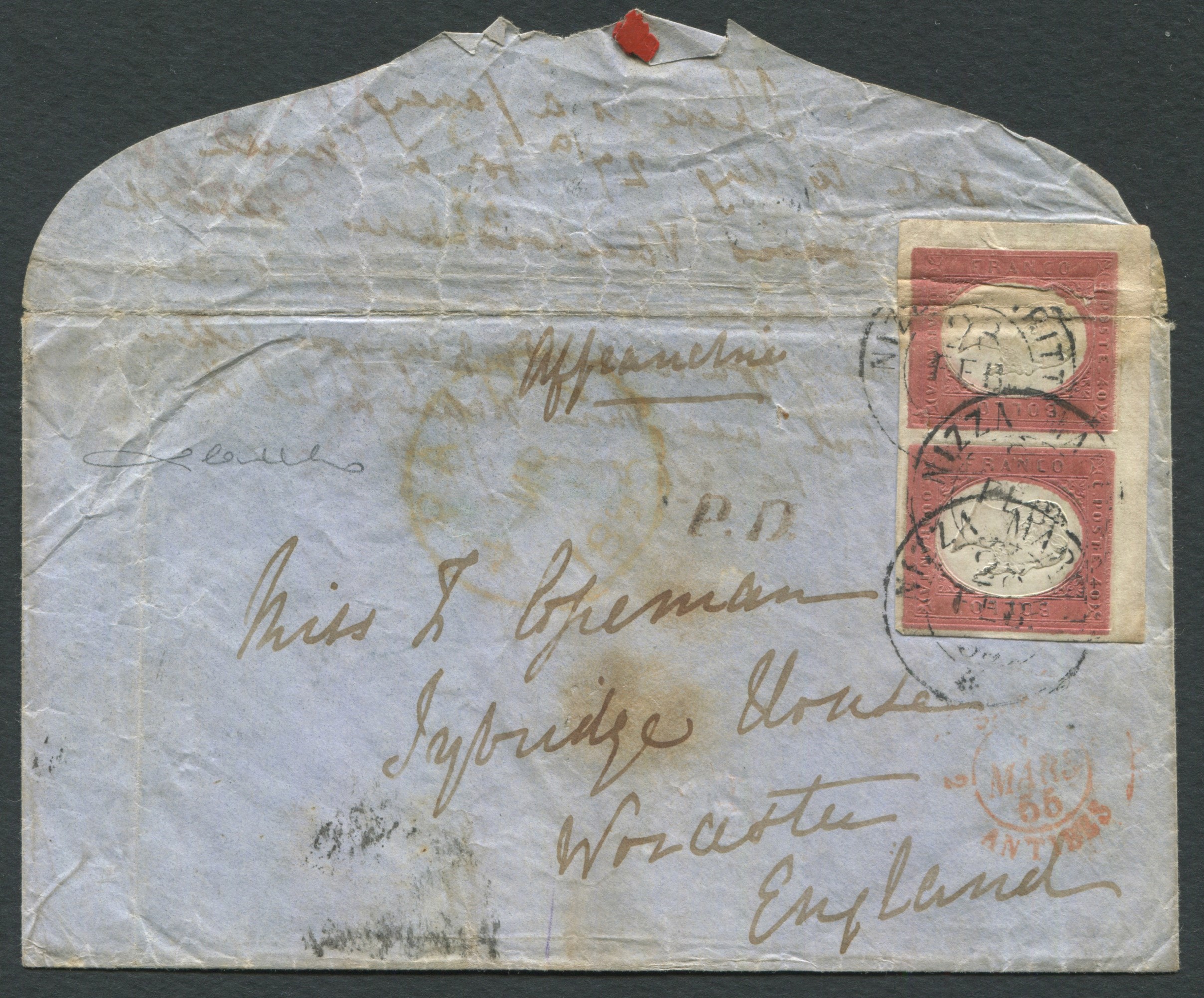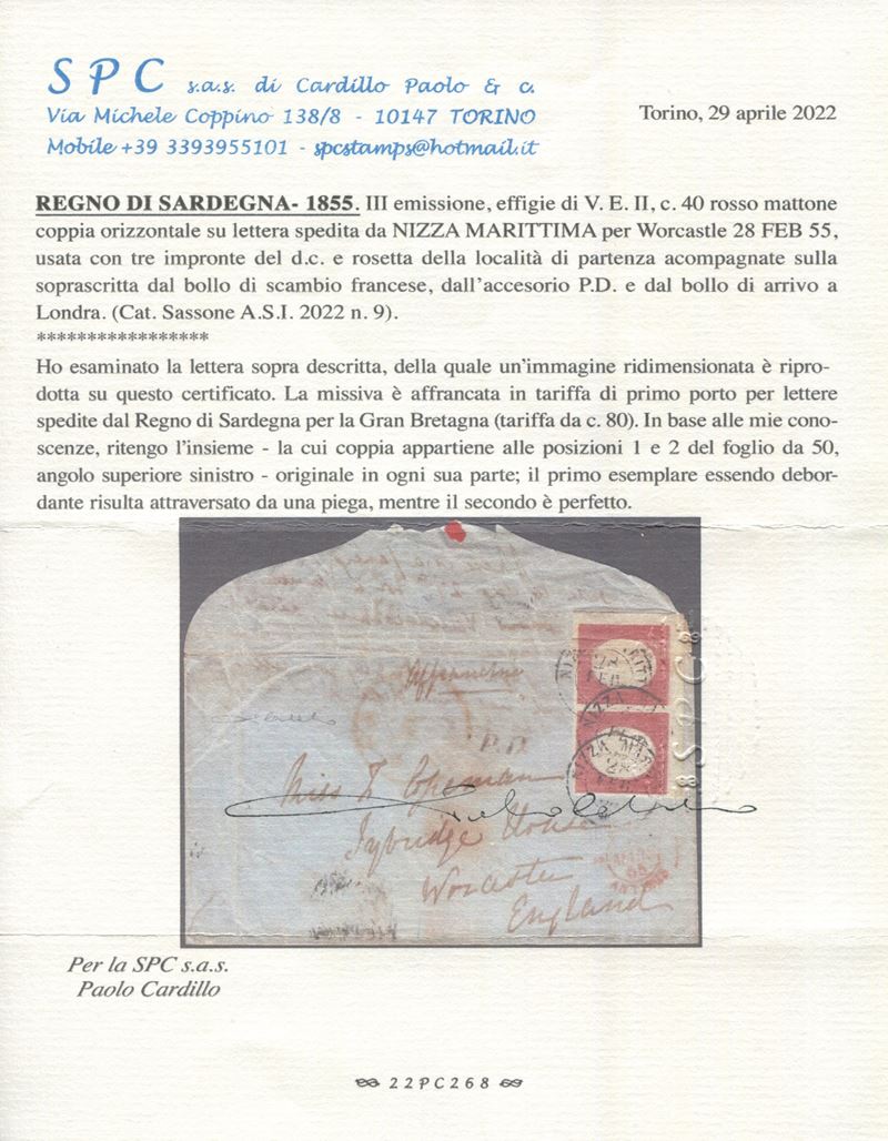 1855 - Regno di Sardegna - III emissione - 40c. rosso mattone (pos. 1 e 2) adf coppia orizzontale (Sass. 9) su lettera da Nizza Marittima a Worcastle del 28 febbraio.