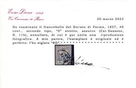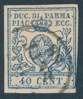 1857 – Ducato di Parma – 40 cent. azzurro, II tipo, “0” stretto, annullato (Sass. 11b).