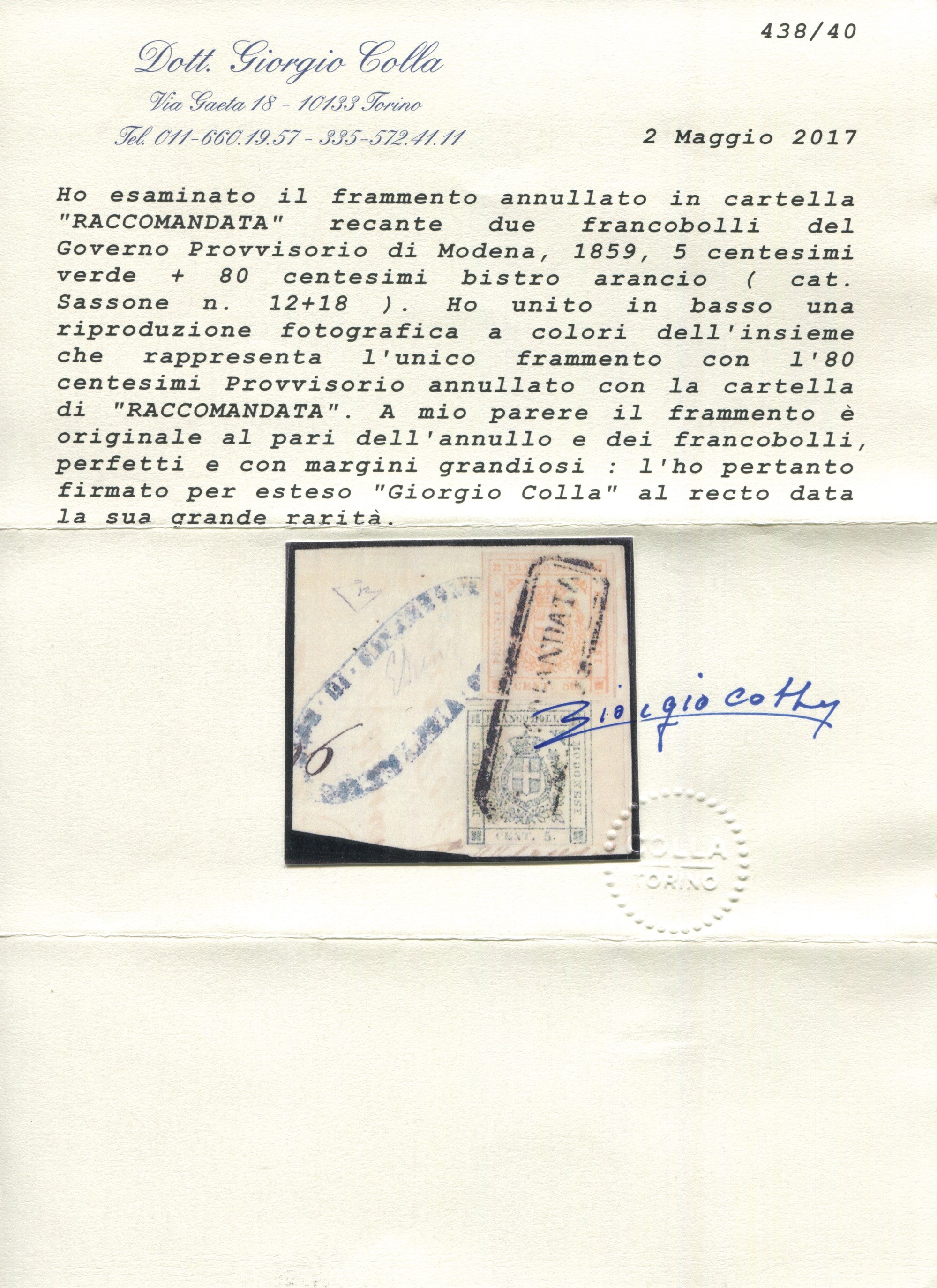 1859 - Ducato di Modena - Governo Provvisorio - 5c. verde e 80c. bistro arancio (Sass. 12 e 18) su frammento annullato in cartella RACCOMANDATA