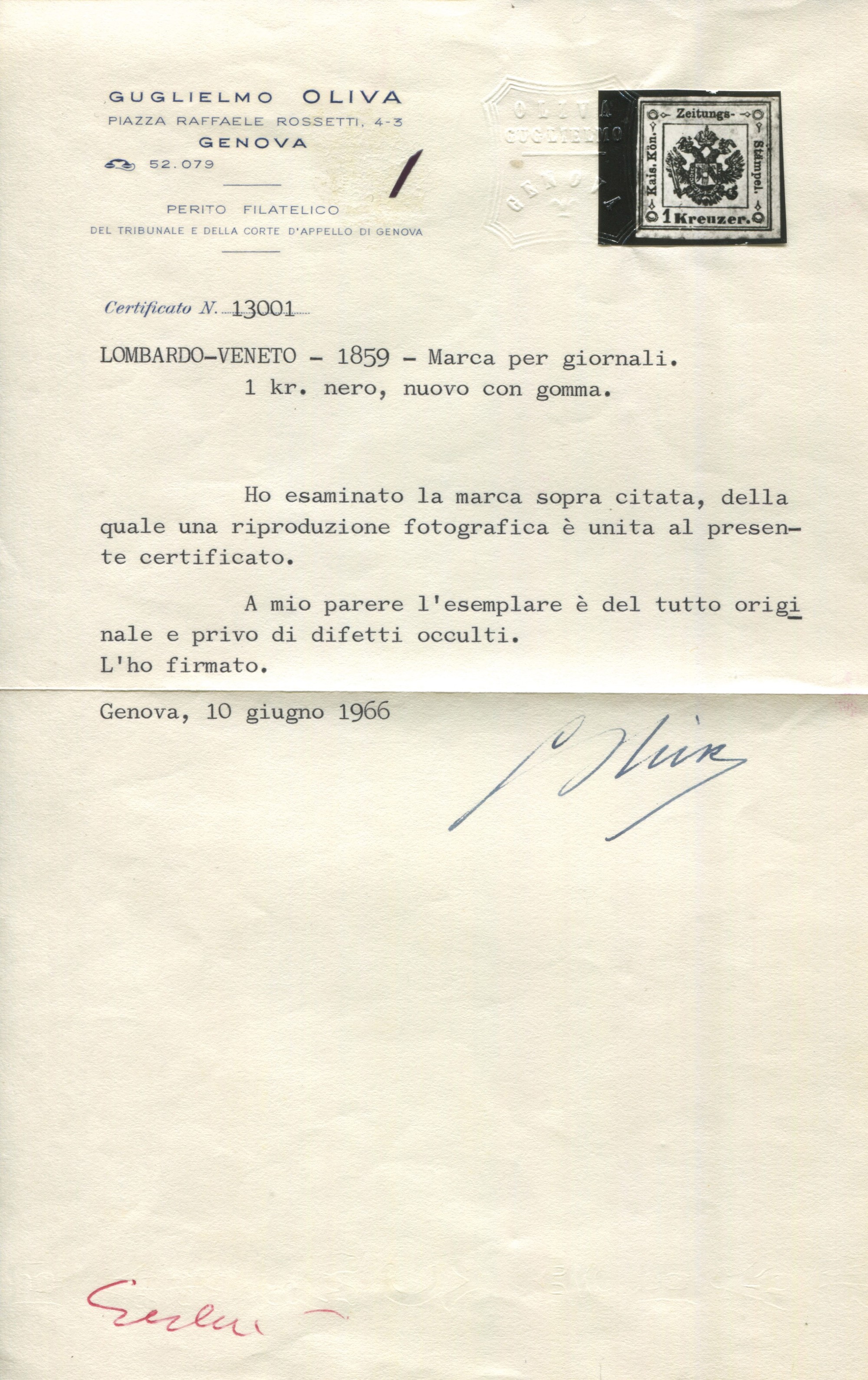 1859 - Lombardo-Veneto - Segnatasse per giornali - 1kr. nero, nuovo (Sass. 2).