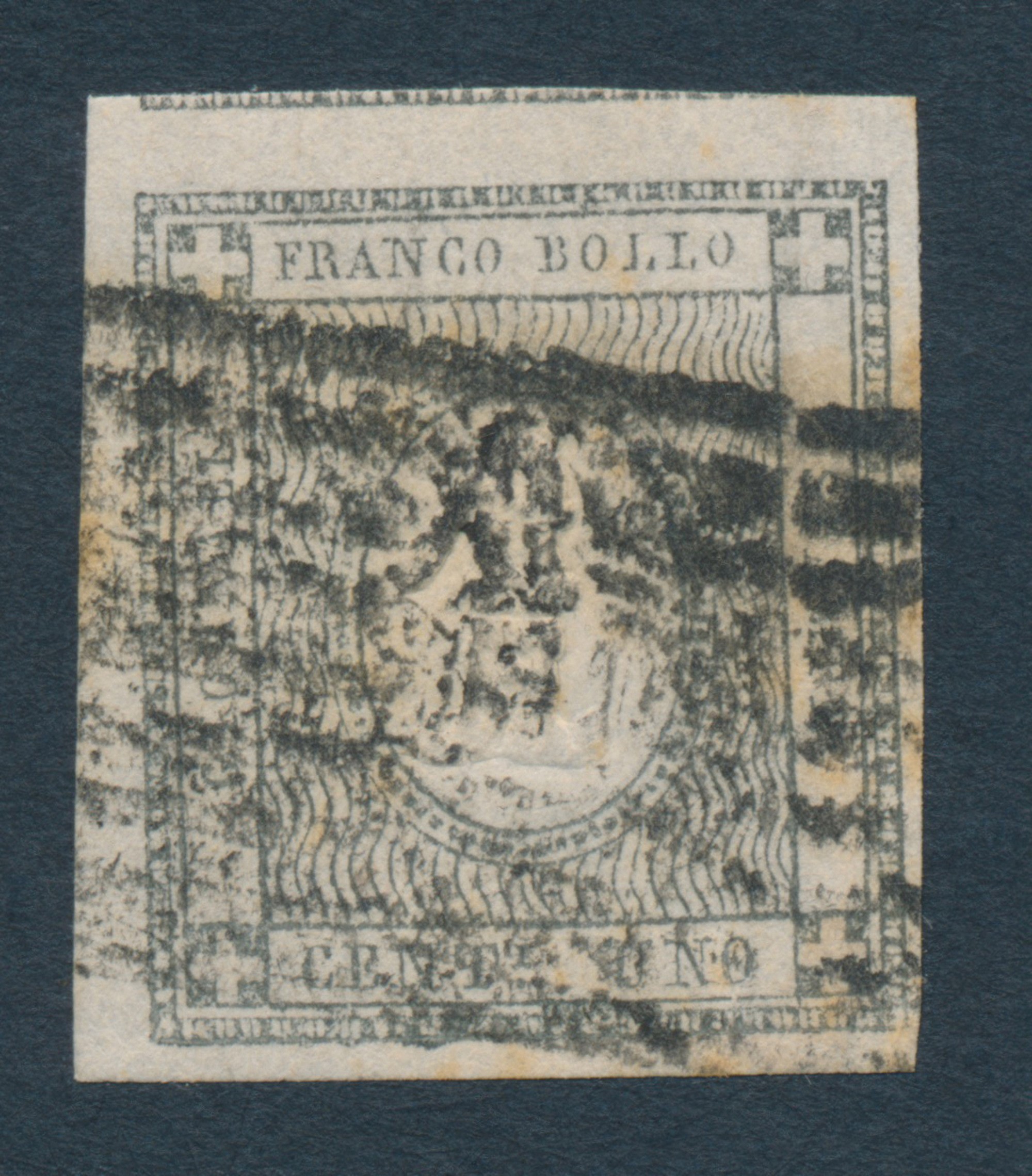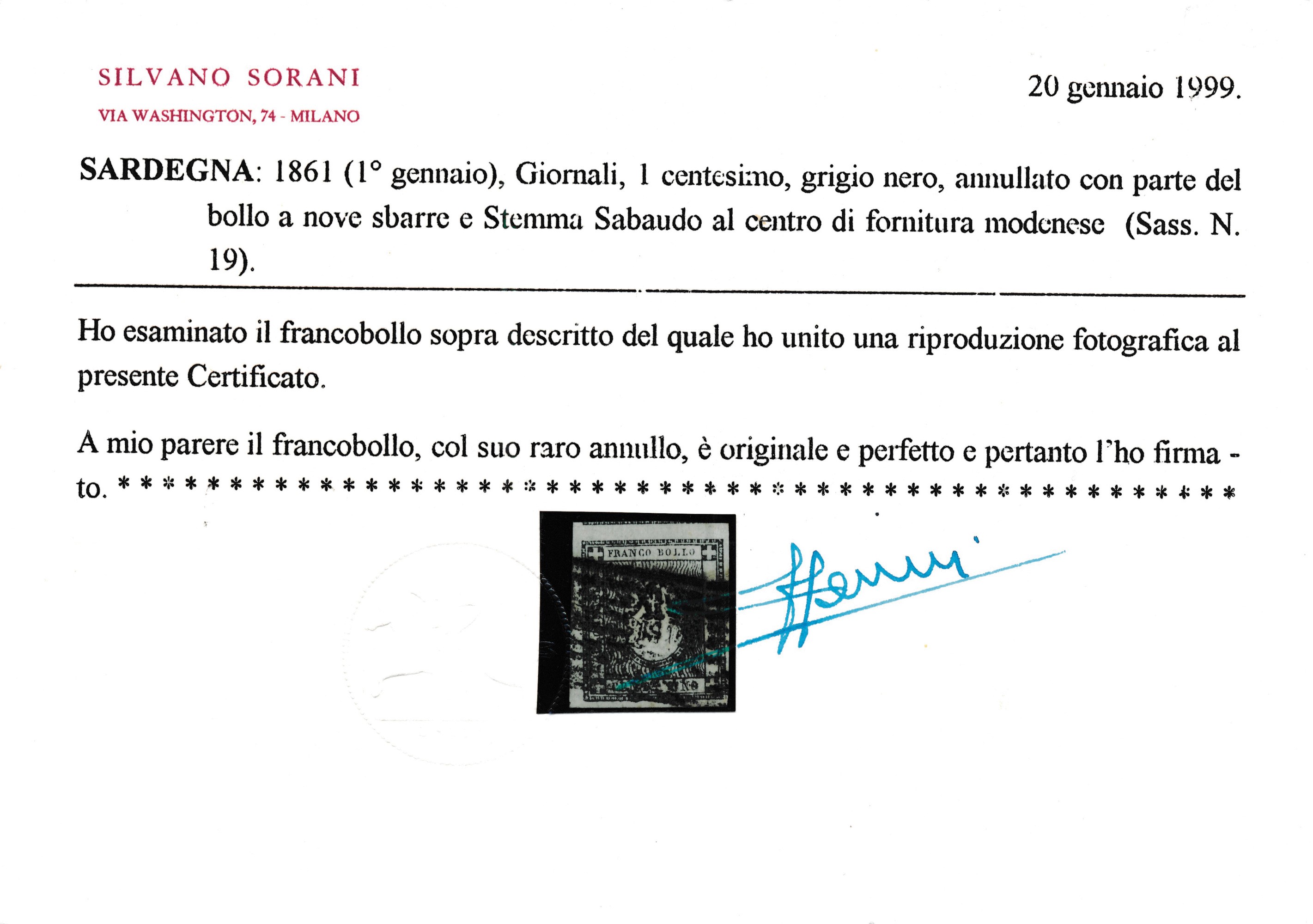 1861 – Sardegna – Francobolli per stampati – 1 cent. grigio nero (Sass. 19) annullato con parte del bollo a nove sbarre e Stemma Sabaudo, al centro, di fornitura modenese.