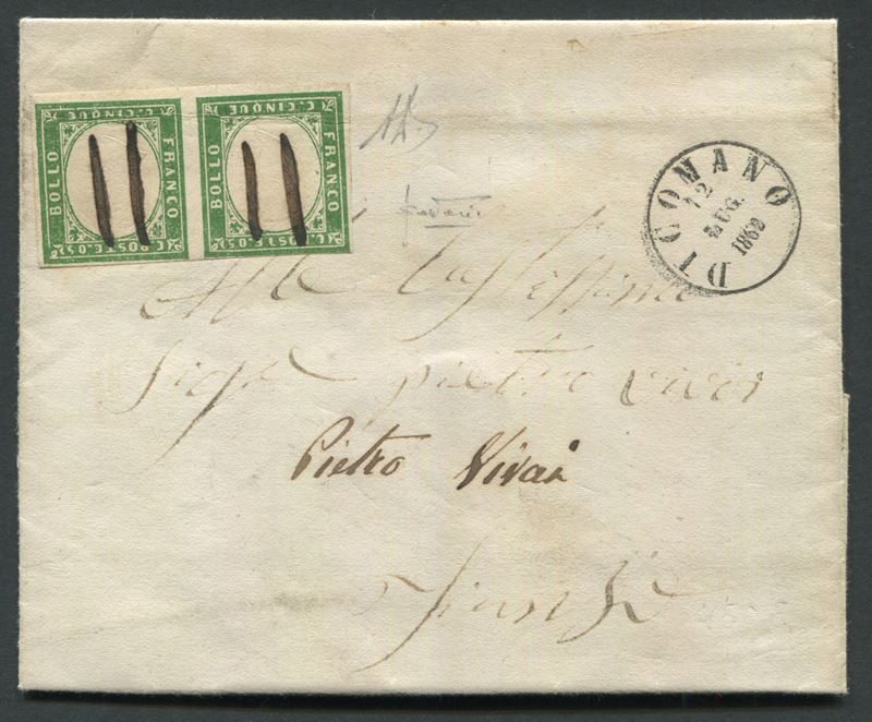 1862 - Regno di Sardegna - IV emissione - 5c. verde scuro coppia orizz. (Sass. 13D) su lettera da Dicomano a Firenze del [..]