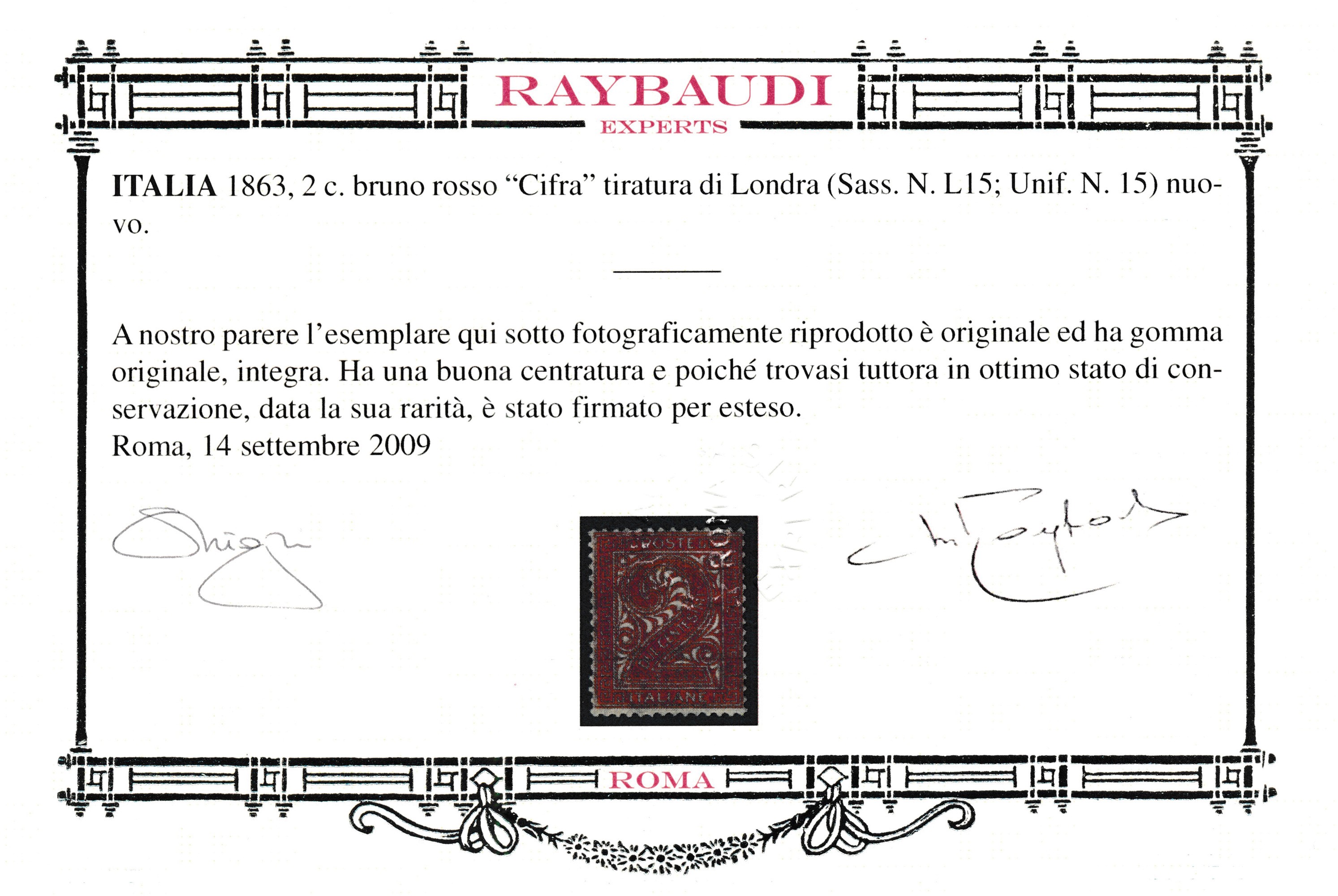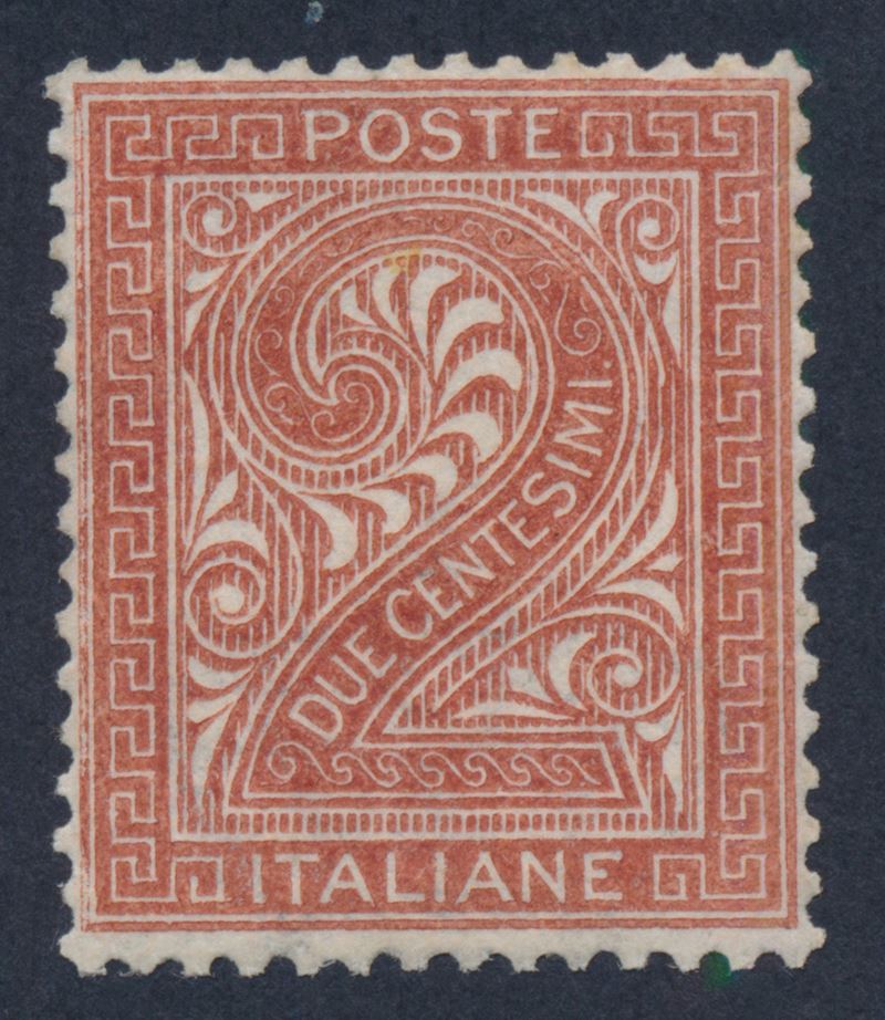 1863 – Regno d’Italia – 2 cent. bruno rosso, Tiratura di Londra (Sass. L15).