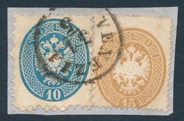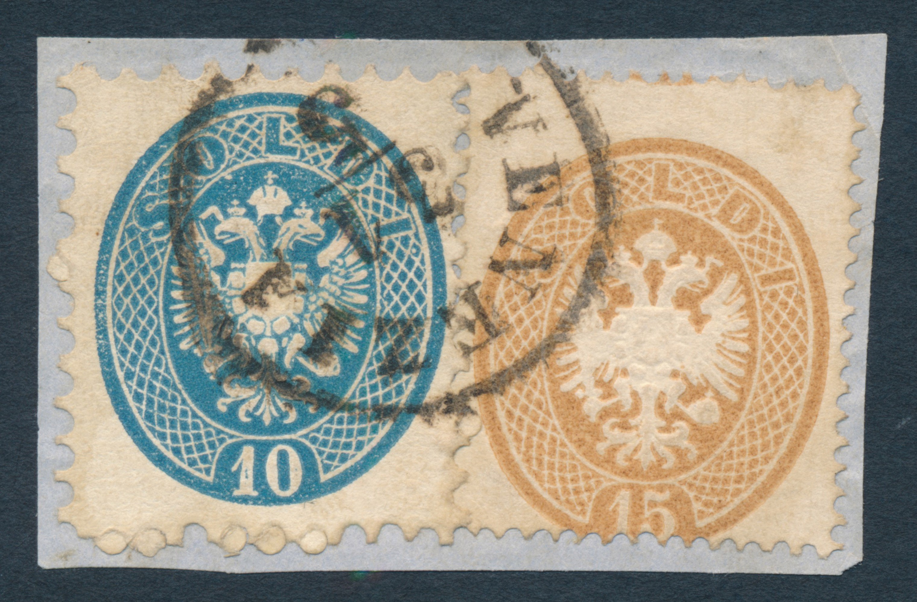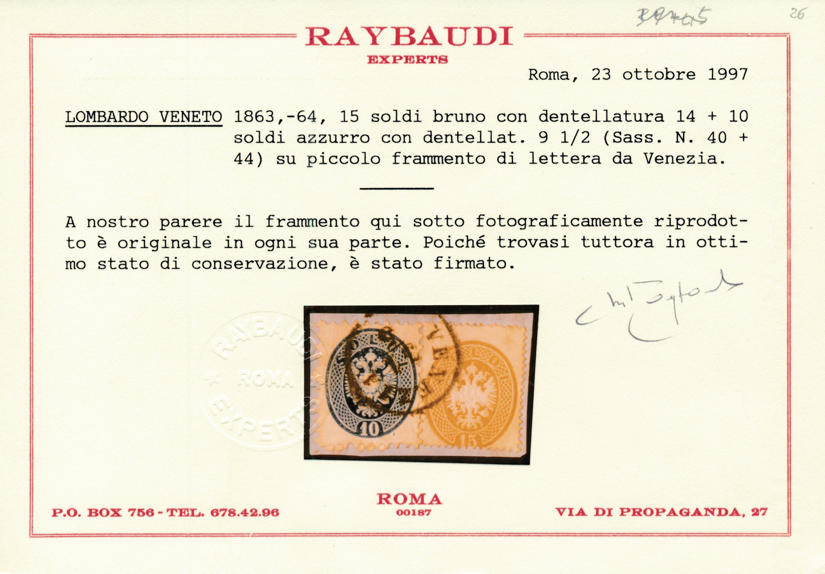 1863-64 – Lombardo-Veneto – 15 soldi bruno dent. 14 (Sass. 40) e 10 soldi azzurro dent. 9½ (Sass. 44) su piccolo frammento ed annullo di Venezia.