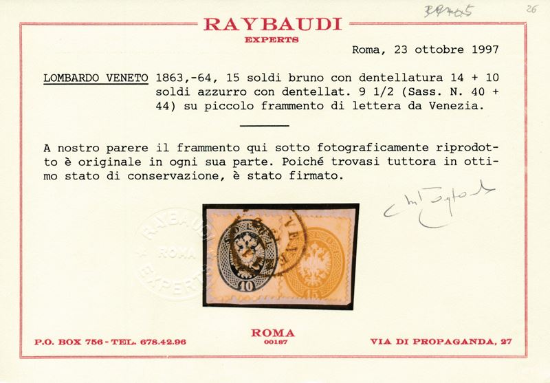 1863-64 – Lombardo-Veneto – 15 soldi bruno dent. 14 (Sass. 40) e 10 soldi azzurro dent. 9½ (Sass. 44) su piccolo frammento [..]