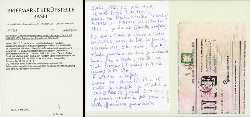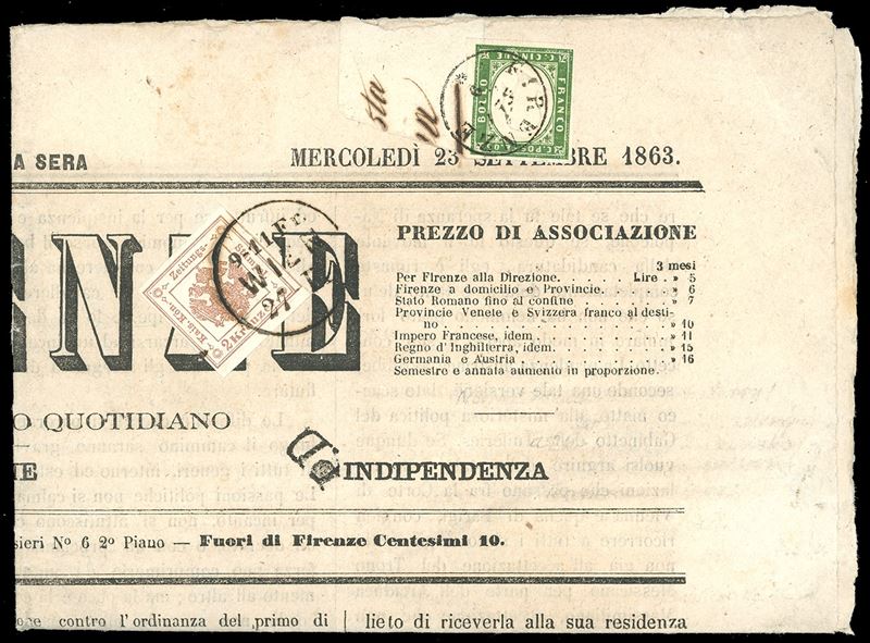 Inviato da Firenze per Vienna del 23 settembre 1863 (fascetta strappata), affrancata con 5 centesimi di Sardegna e, in arrivo, tassato con francobollo da 2 kreuzer bruno, tipo II, annullato con timbro C1 di Vienna del 27 settembre. Francobolli perfetti, bella affrancatura pseudo-mista. Raro, Certificato Martin Eichele.