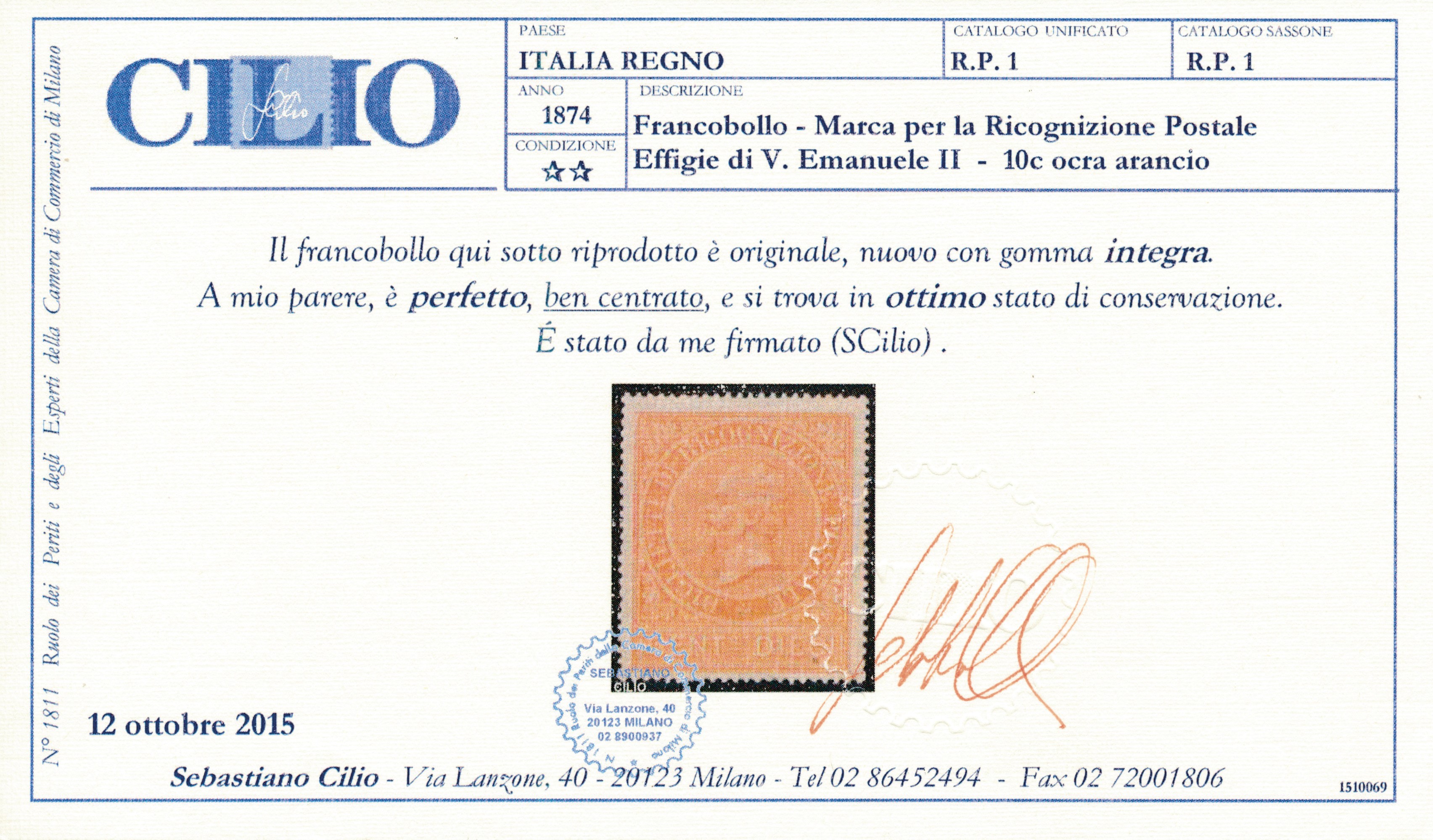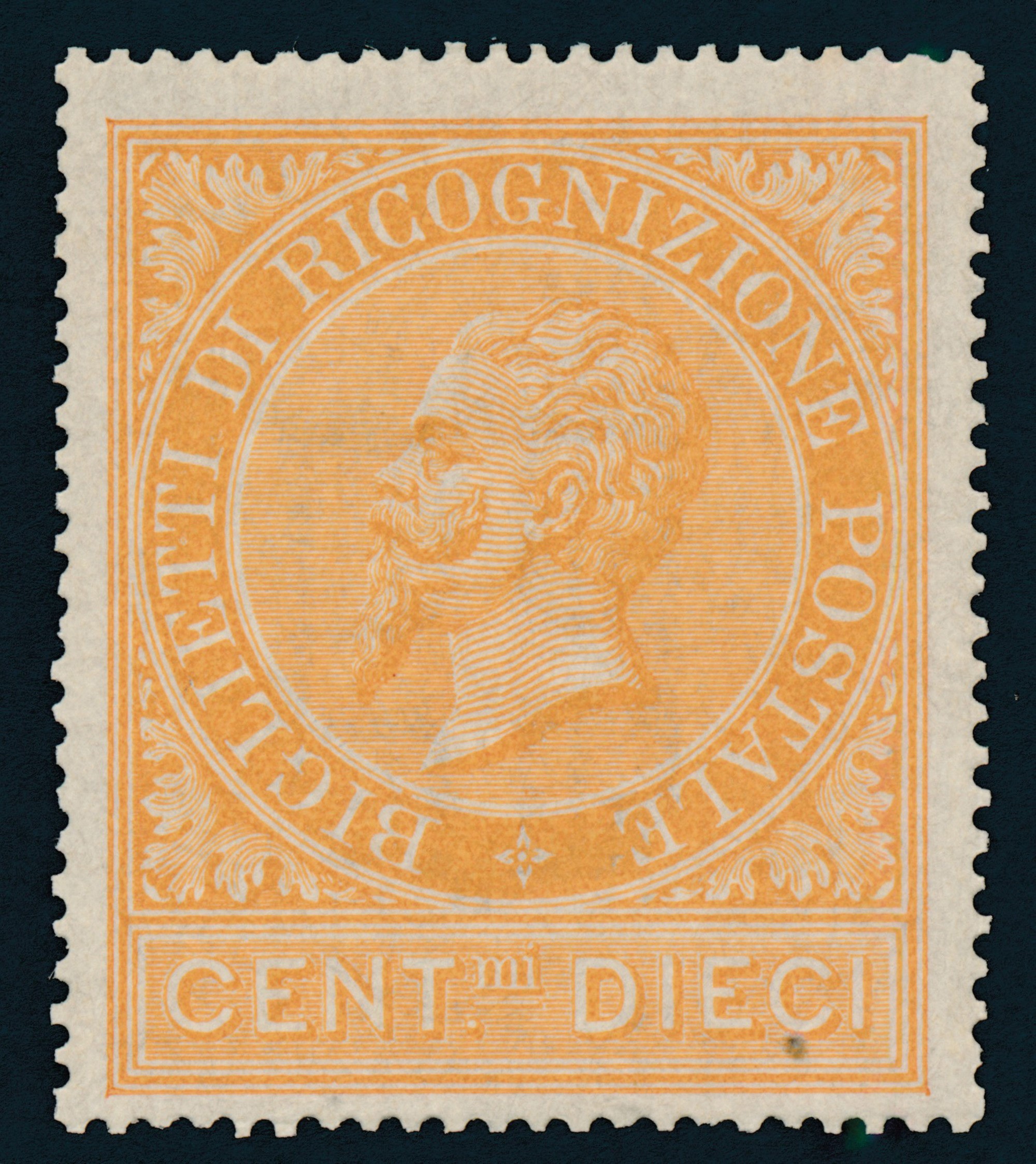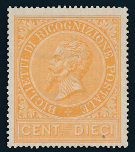 1874 – Regno d’Italia – Ricognizione Postale – 10 cent. ocra arancio (Sass. 1).