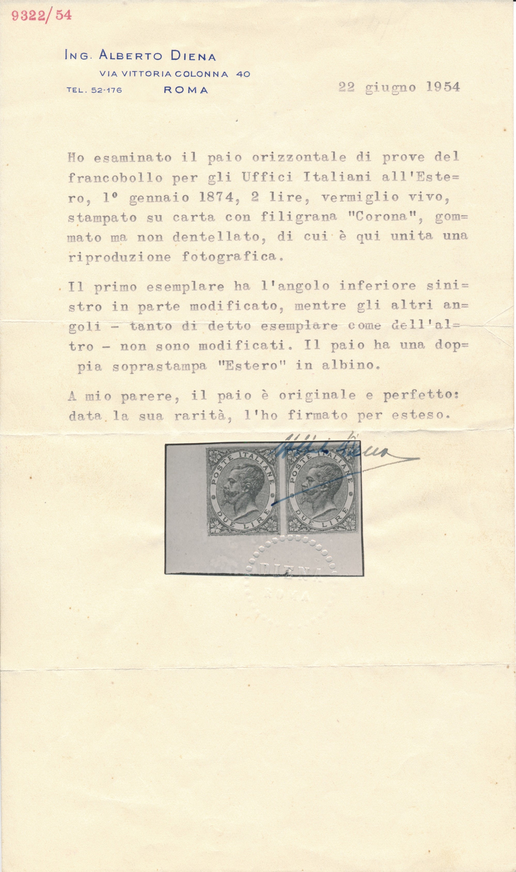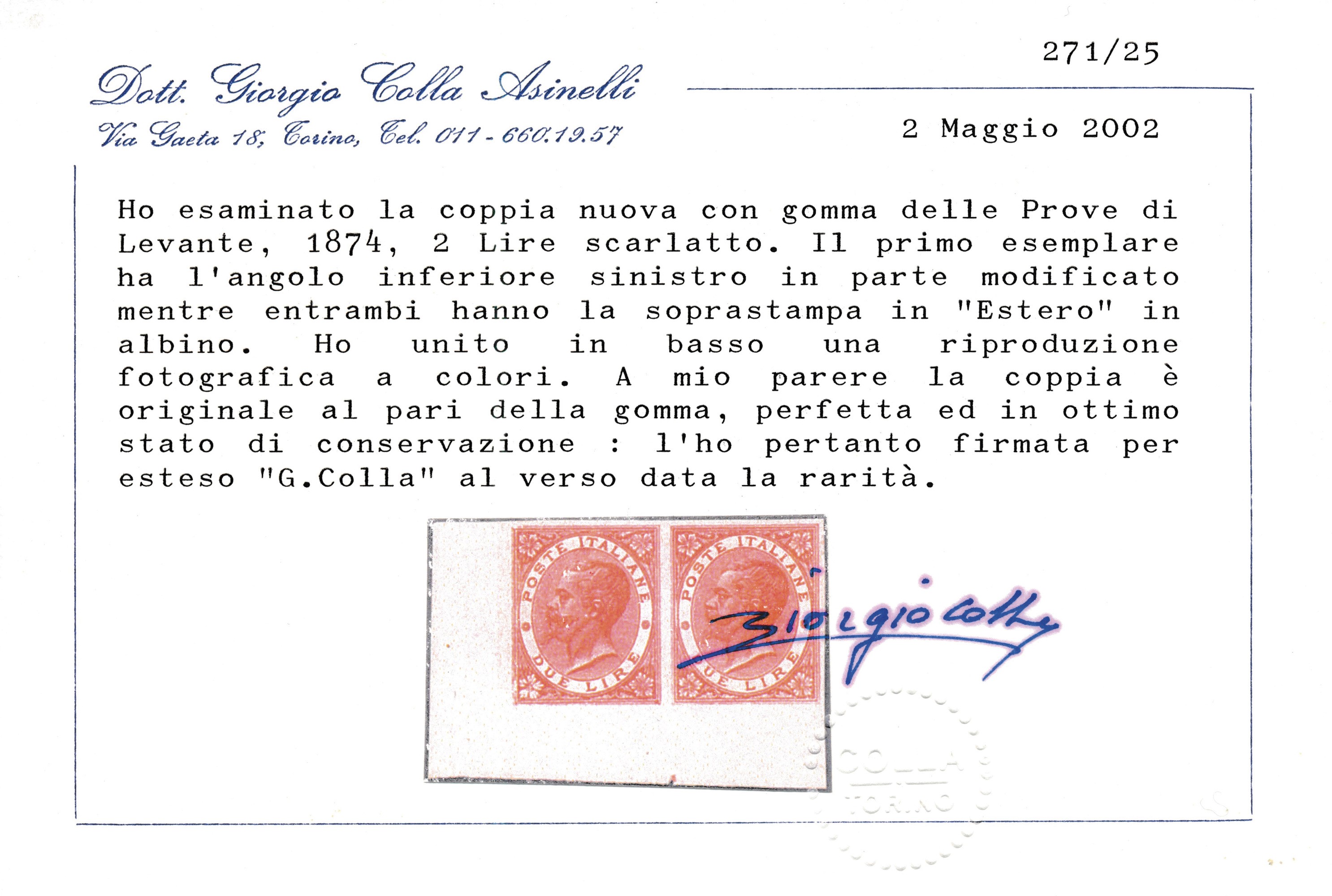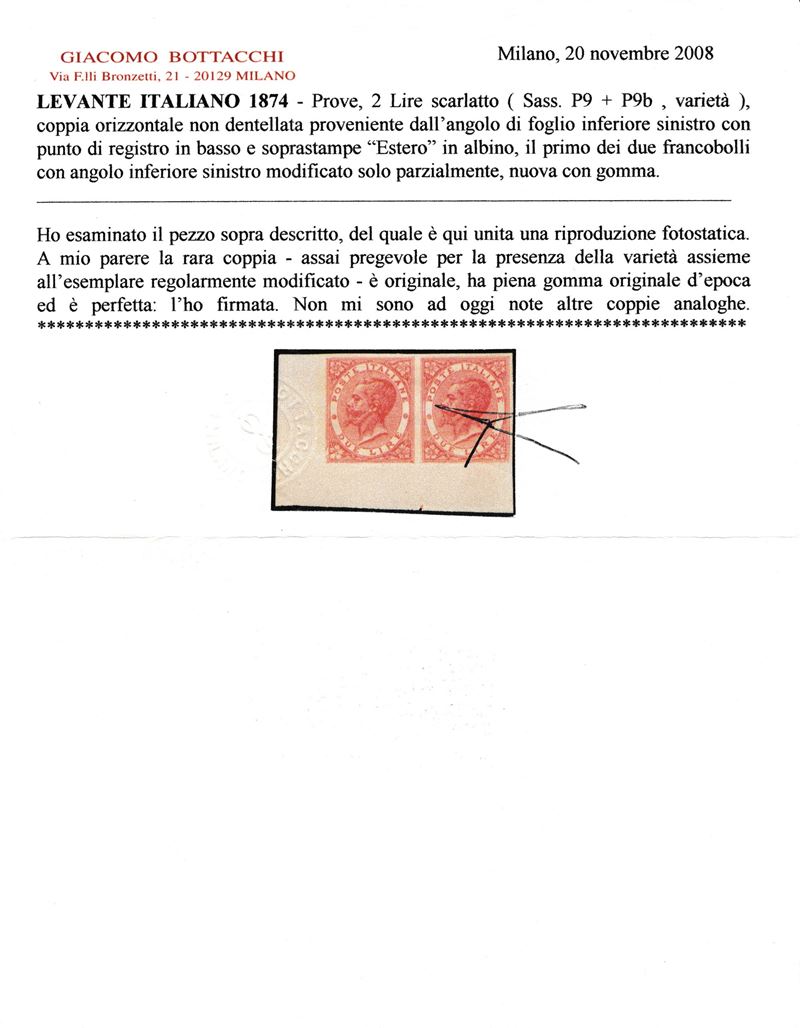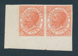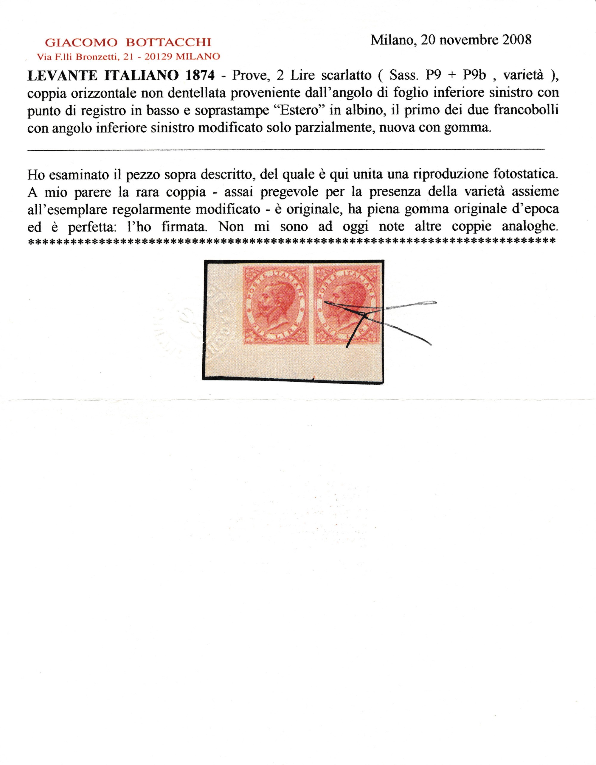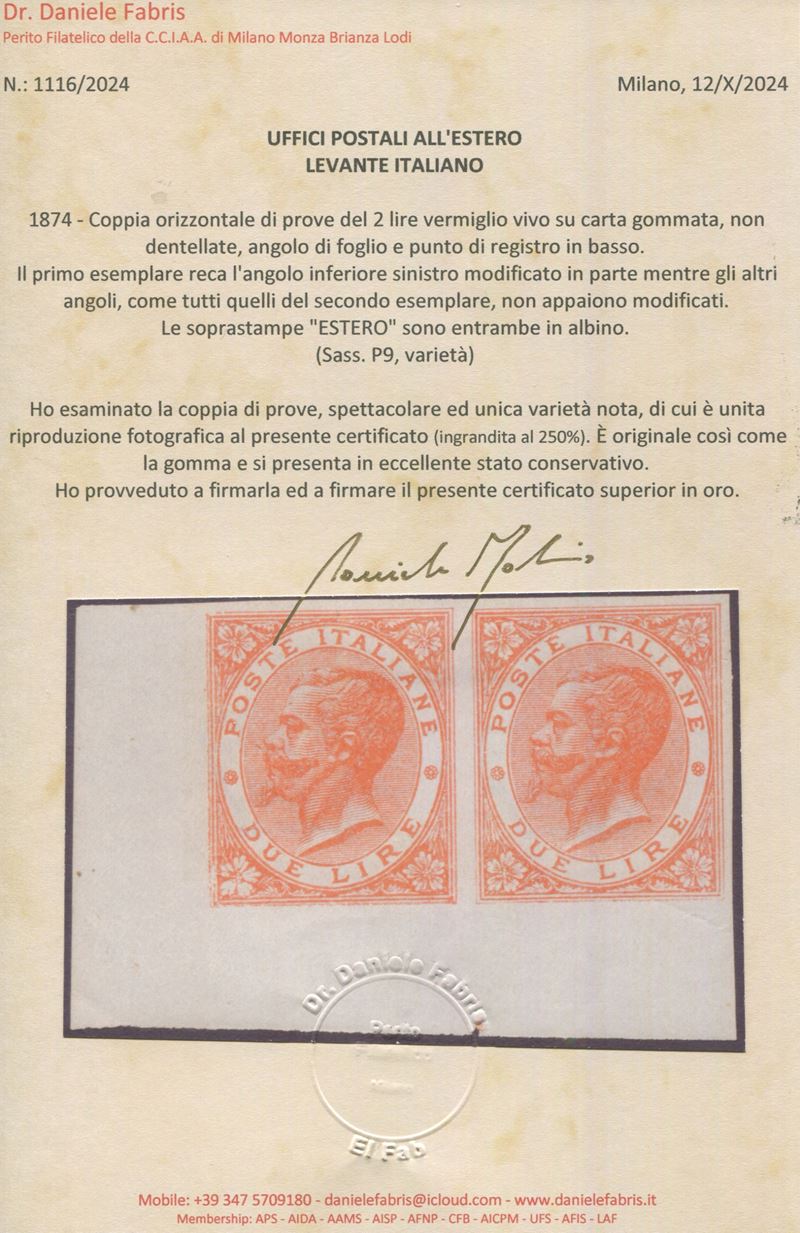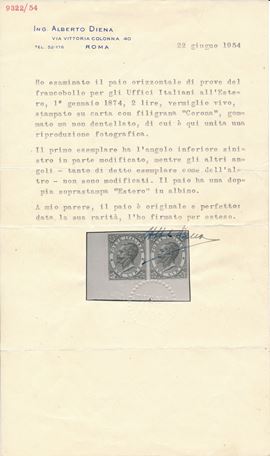 1874 - Regno d’Italia - Uffici Postali all’estero - Levante - Emissioni generali - Coppia orizzontale di prove del 2 lire vermiglio vivo su carta gommata e con filigrana corona, non dentellate, angolo di foglio e punto di registro in basso (Sass. P9, varietà) - Il primo esemplare reca l'angolo inferiore sinistro modificato in parte mentre gli altri angoli, come tutti quelli del secondo esemplare, non appaiono modificati - Le soprastampe "ESTERO" sono entrambe in albino.