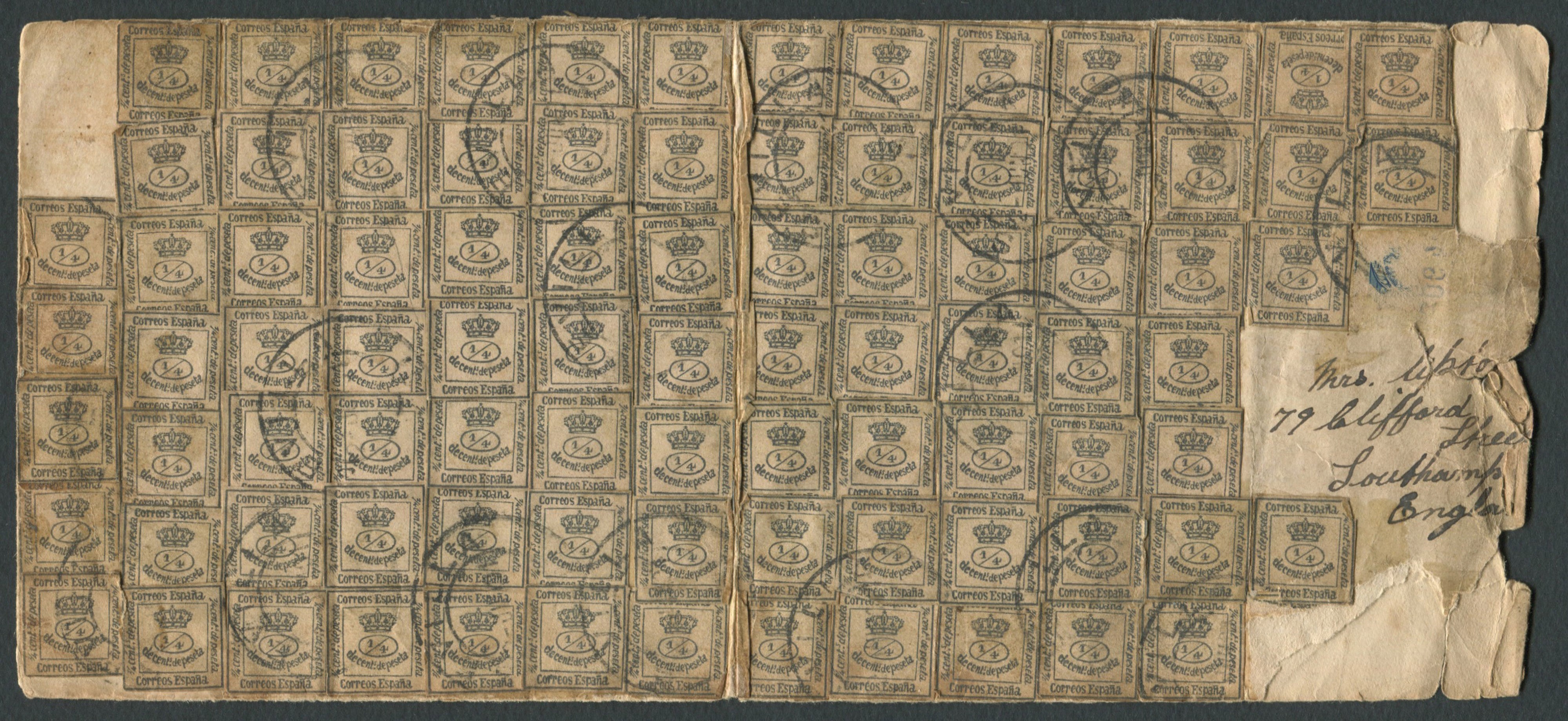1901 - Spagna - Lettera da Siviglia a Southampton del 2 gennaio affrancata con ben 93 esemplari del framcobollo delle reggenza spagnola del 1873, 1/4 peseta verde giallo (Unif. 140)