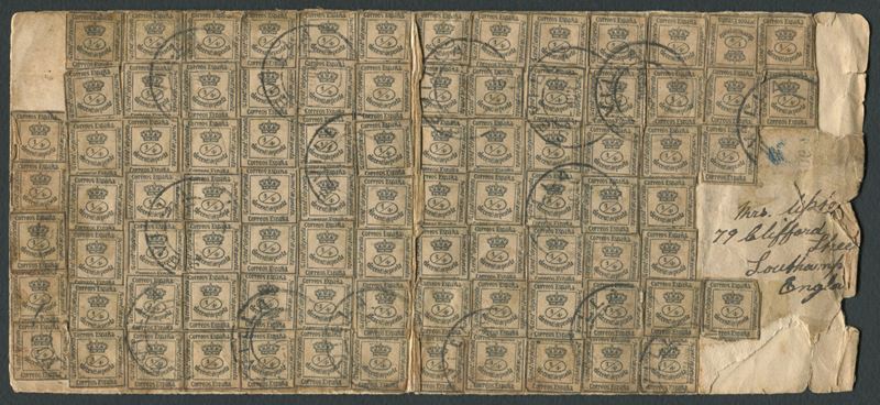1901 - Spagna - Lettera da Siviglia a Southampton del 2 gennaio affrancata con ben 93 esemplari del framcobollo delle reggenza [..]