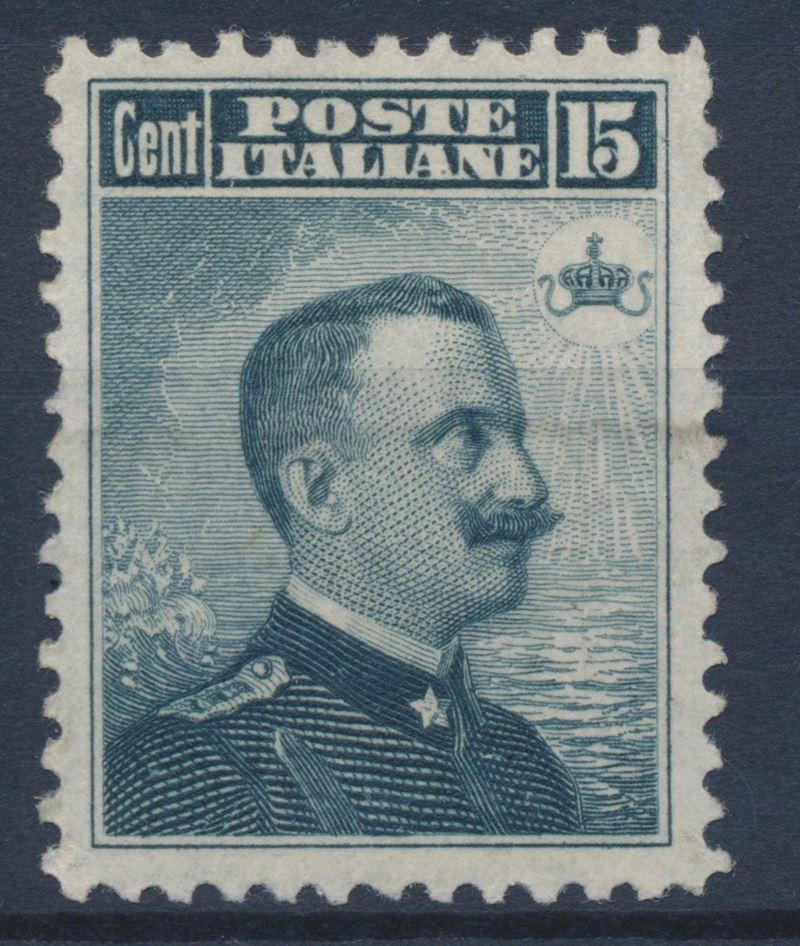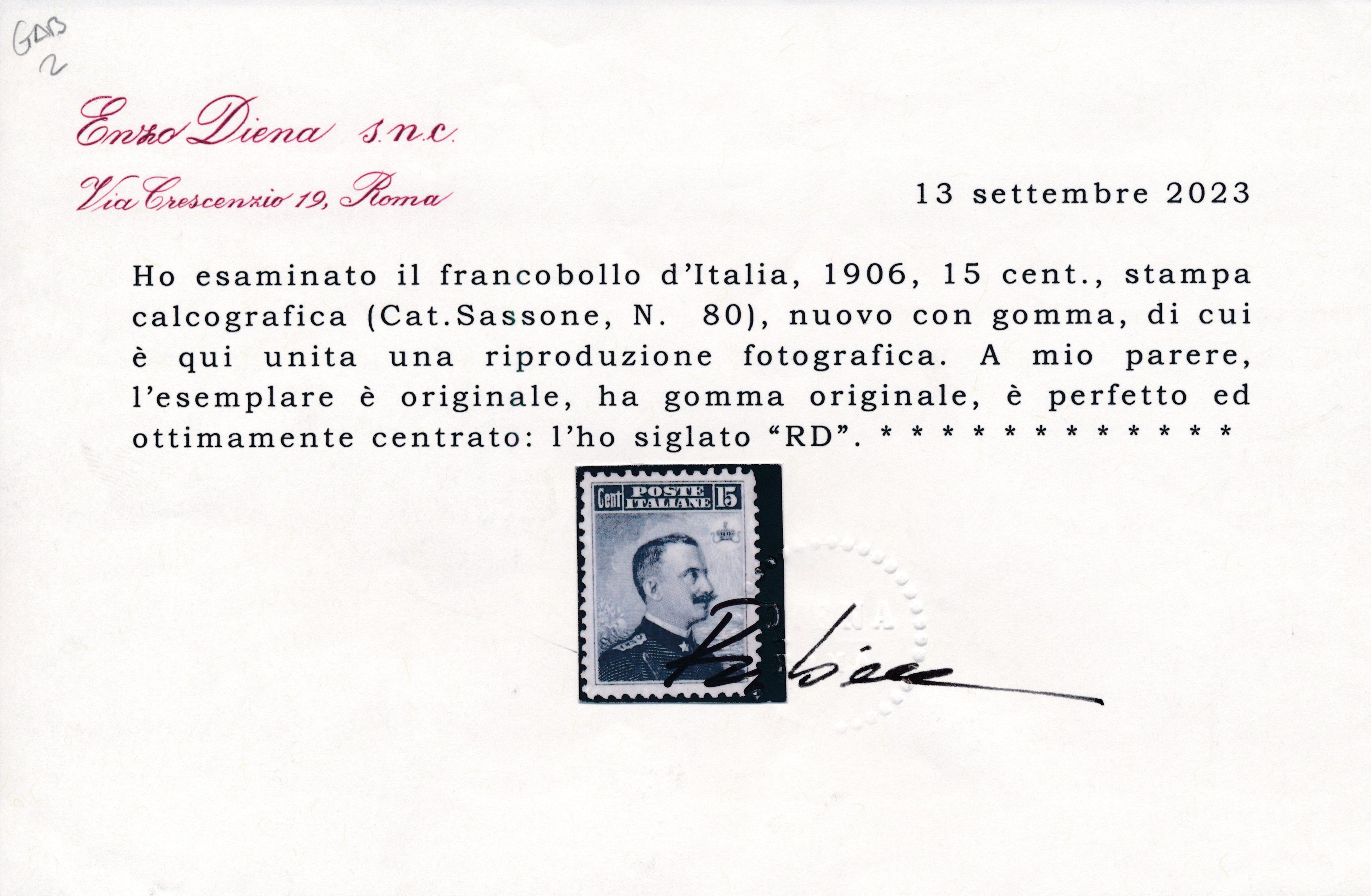 1906 – Regno d’Italia – 15 cent. grigio nero “Michetti”, dent. 12, gomma originale (Sass. 80).