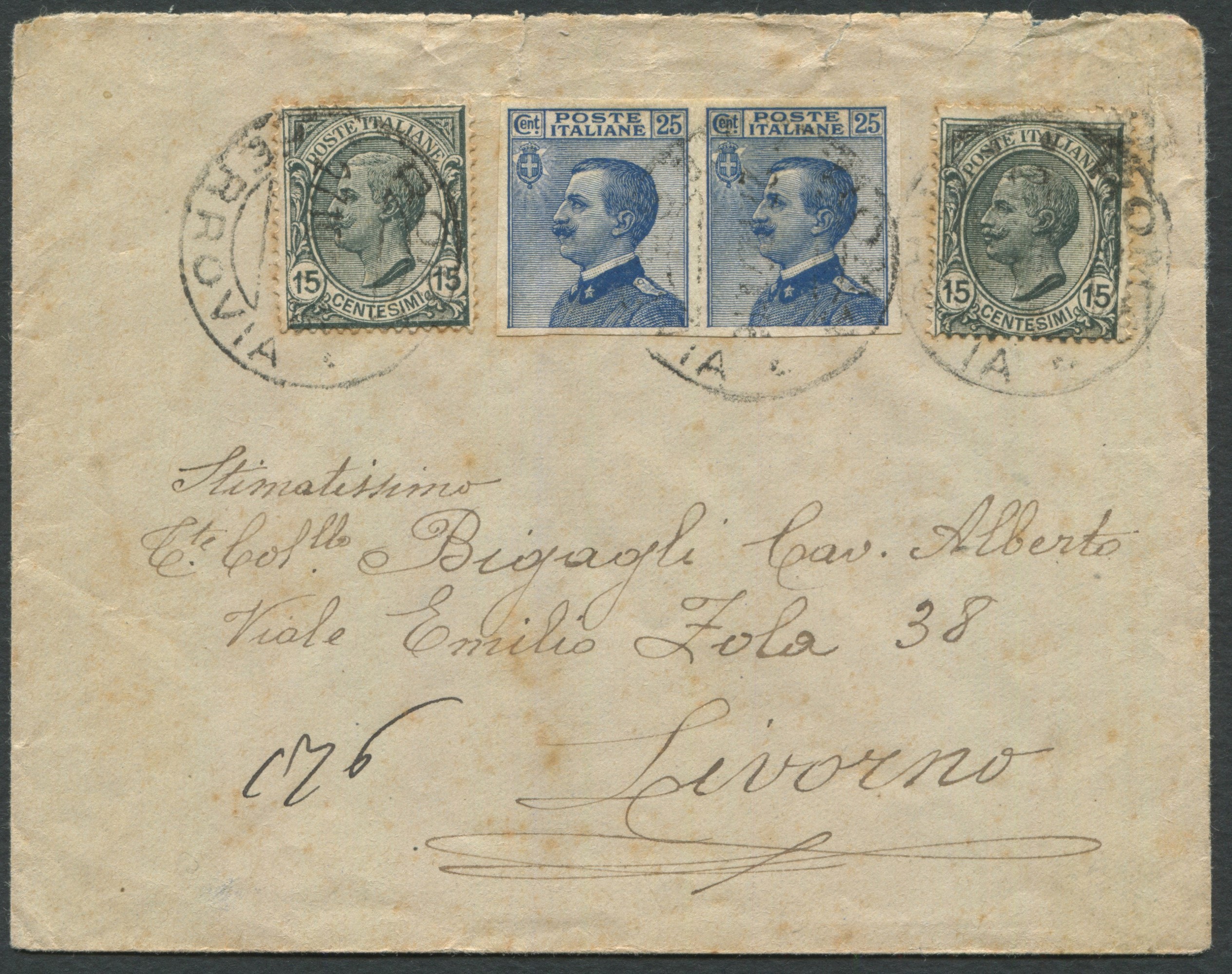 1917 - Regno d’Italia - Letterina da Roma a Livorno affrancata con coppia del 25c. azzurro “Michetti” non dentellata (Sass. 83e).