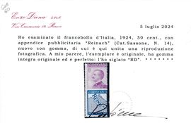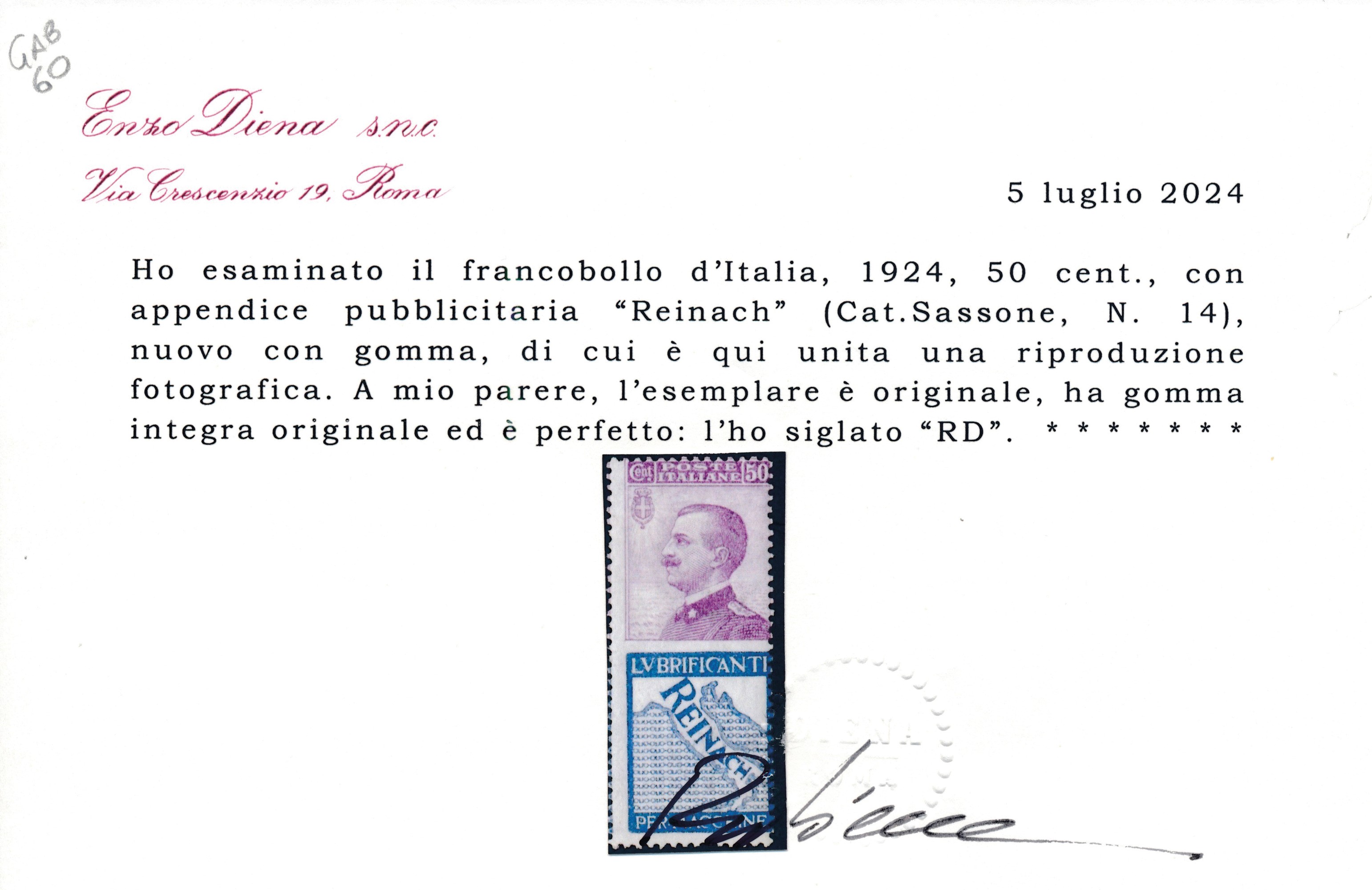 1924 – Regno d’Italia – Francobolli pubblicitari – 50 cent. violetto e azzurro “REINACH” (Sass. 14).