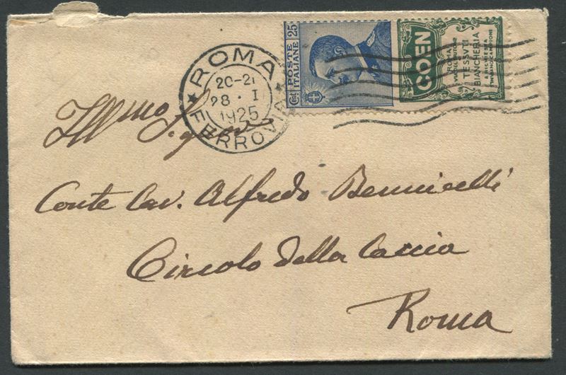 1925 - Regno d’Italia - Letterina della Vice presidenza del Senato da Roma a Roma affrancata con francobollo pubblicitario 25c. azzurro “Coen” (Sass. 5).
