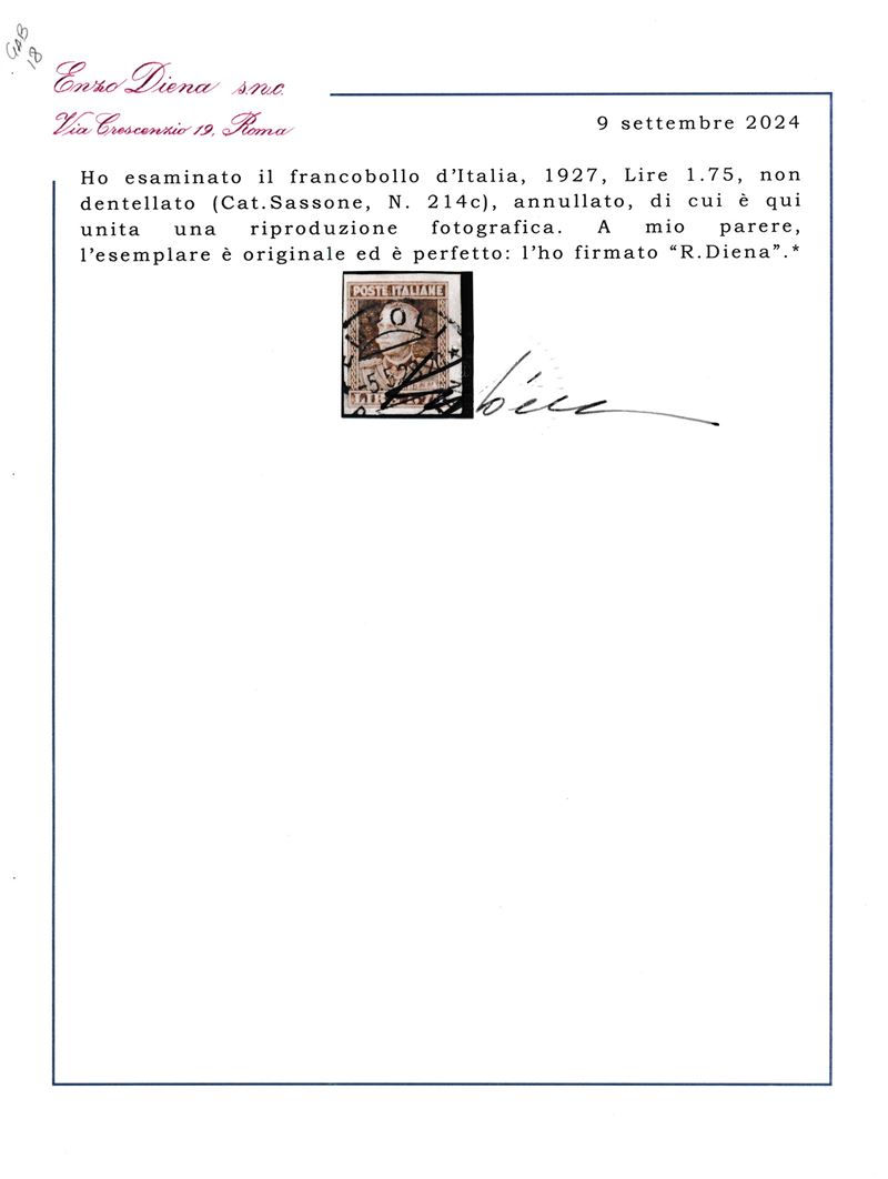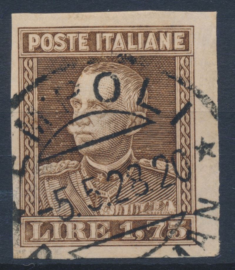 1927 – Regno d’Italia – Effige di Vittorio Emanuele III – 1,75 lire bruno non dentellato (Sass. 214c).
