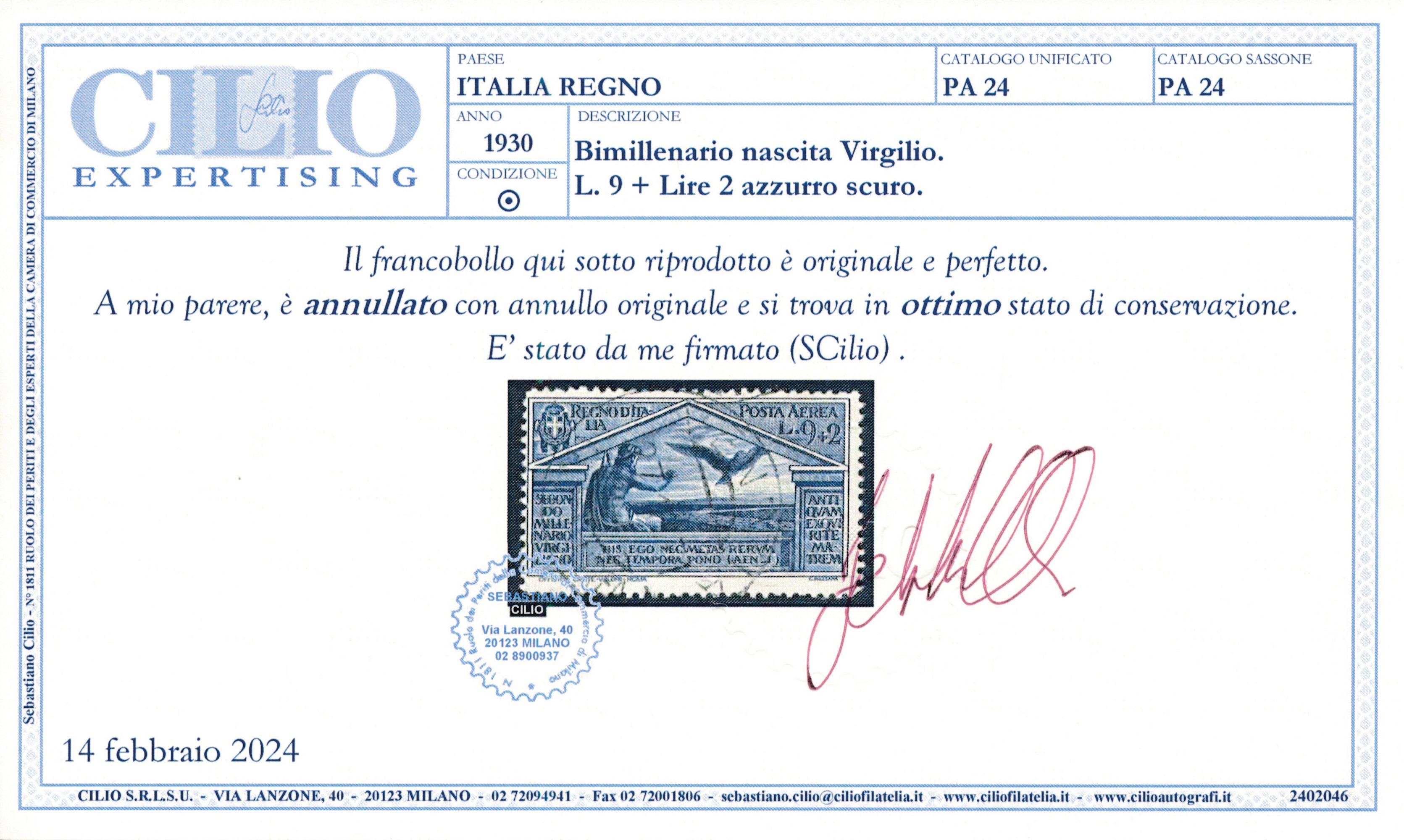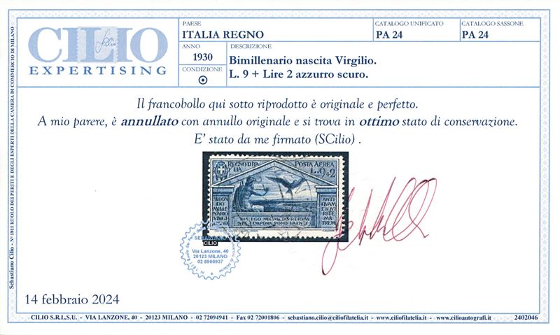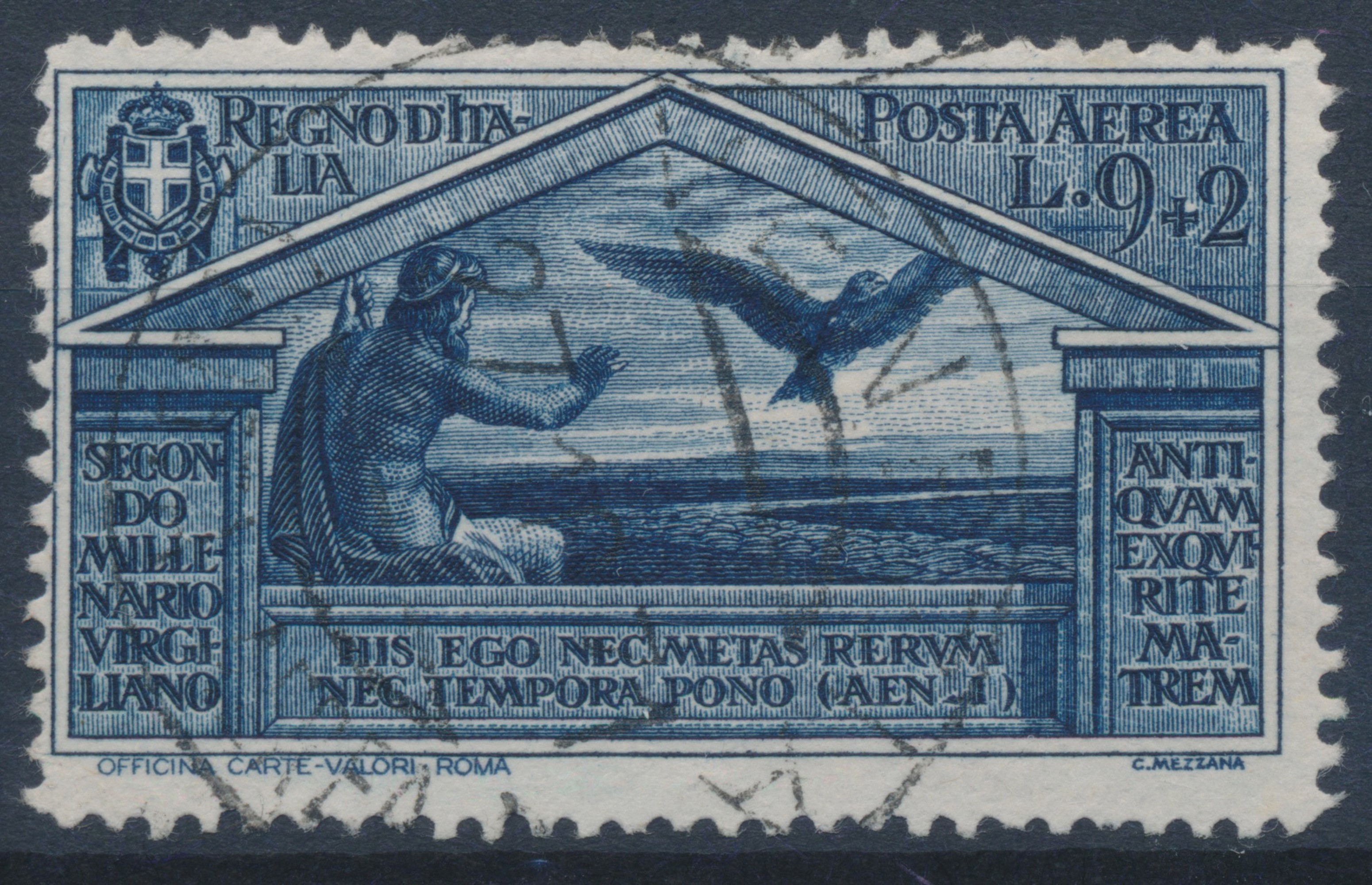 1930 – Regno d’Italia – “Bimillenario della nascita di Virgilio” - 9 lire + 2 lire azzurro scuro usata (Sass. 24).