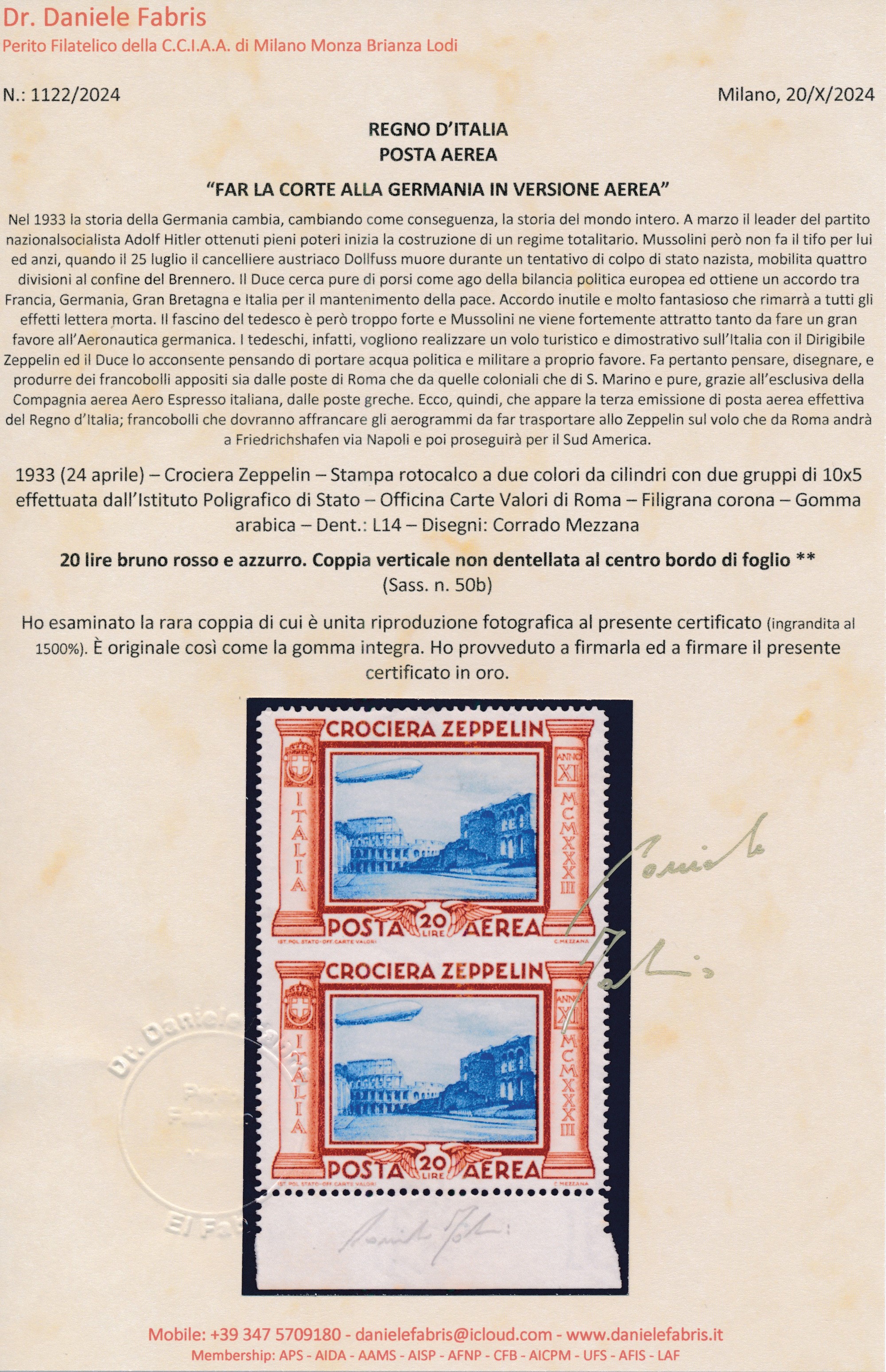 1933 - Regno d’Italia - Posta Aerea - “Crociera Zeppelin” - 20 lire bruno rosso e azzurro coppia verticale bdf non dentellata al centro (Sass. 50b).