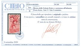 1937 – Regno d’Italia - “Mostra delle Colonie Estive e Assistenza all’infanzia” – Posta aerea - 5 lire + 3 lire carminio (Sass. A105).