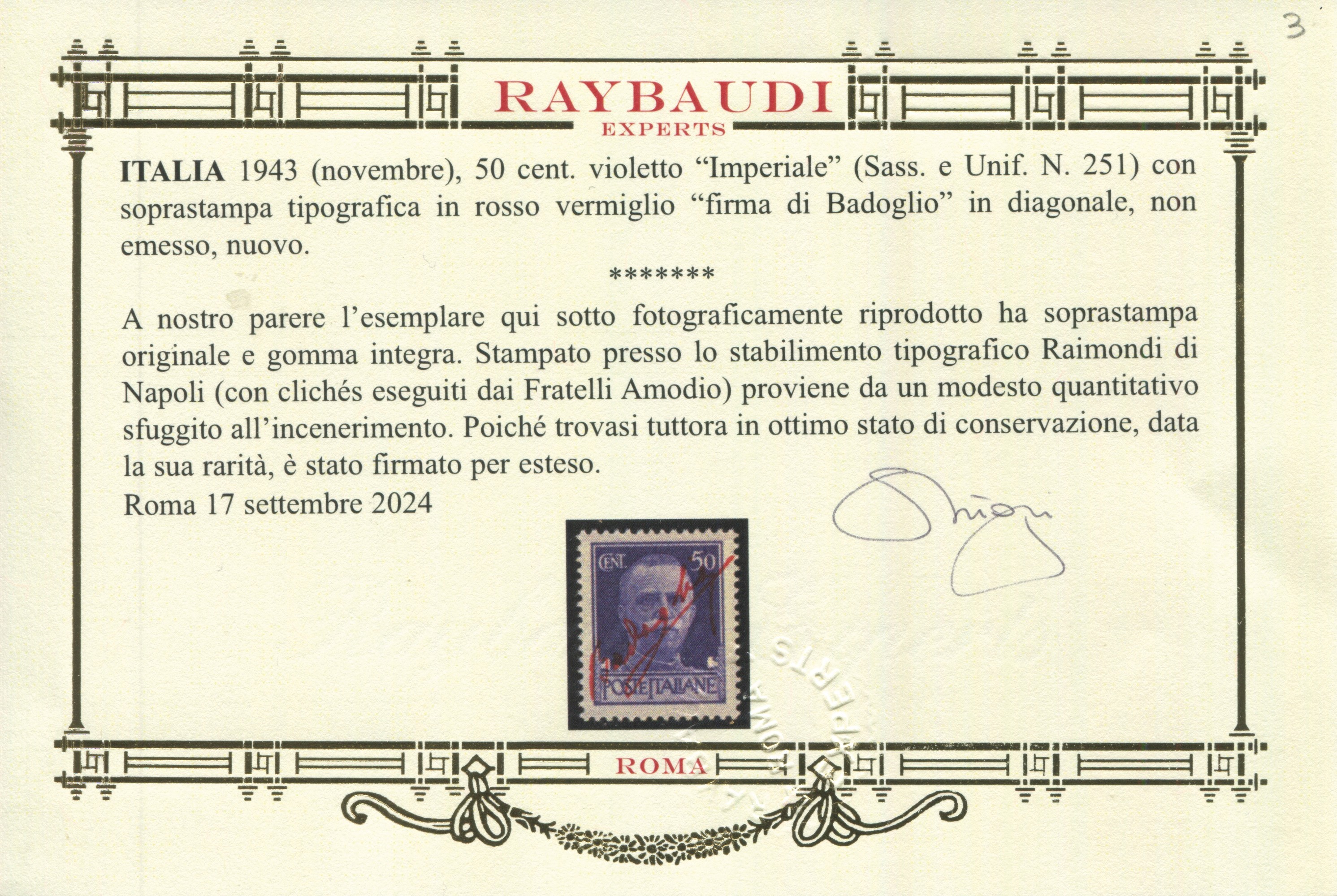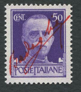 1943 - Luogotenenza - 50 cent. violetto “Imperiale” con soprastampa tipografica in rosso vermiglio “firma di Badoglio” in diagonale, non emesso, gomma integra.