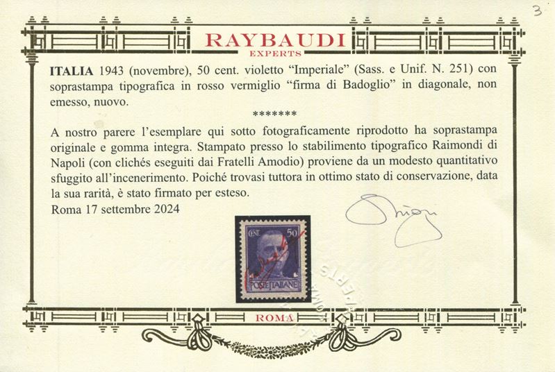 1943 - Luogotenenza - 50 cent. violetto “Imperiale” con soprastampa tipografica in rosso vermiglio “firma di Badoglio” in [..]