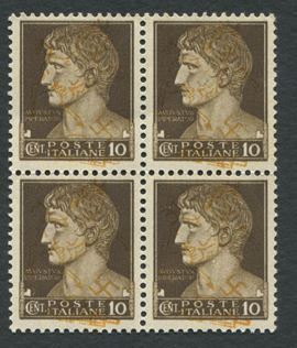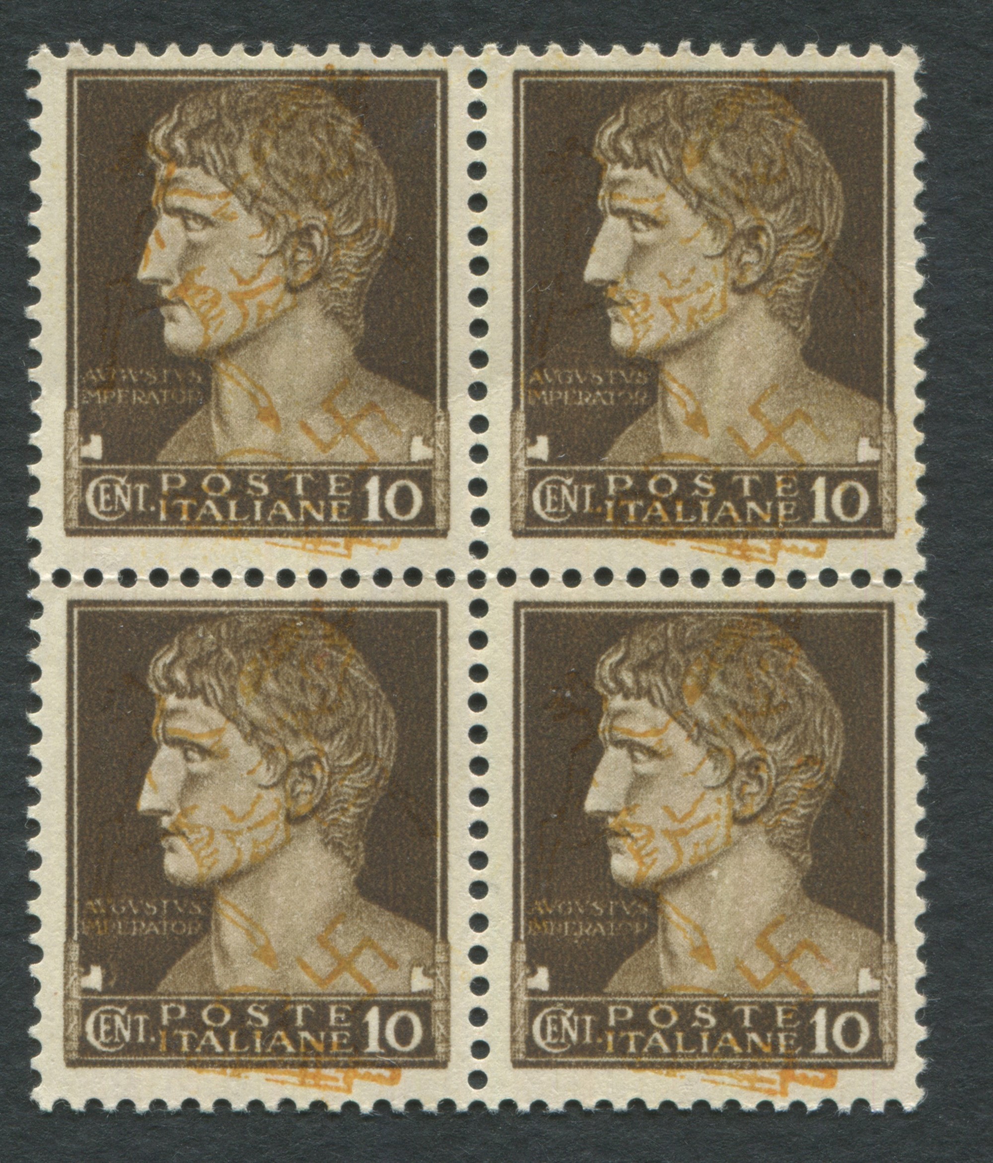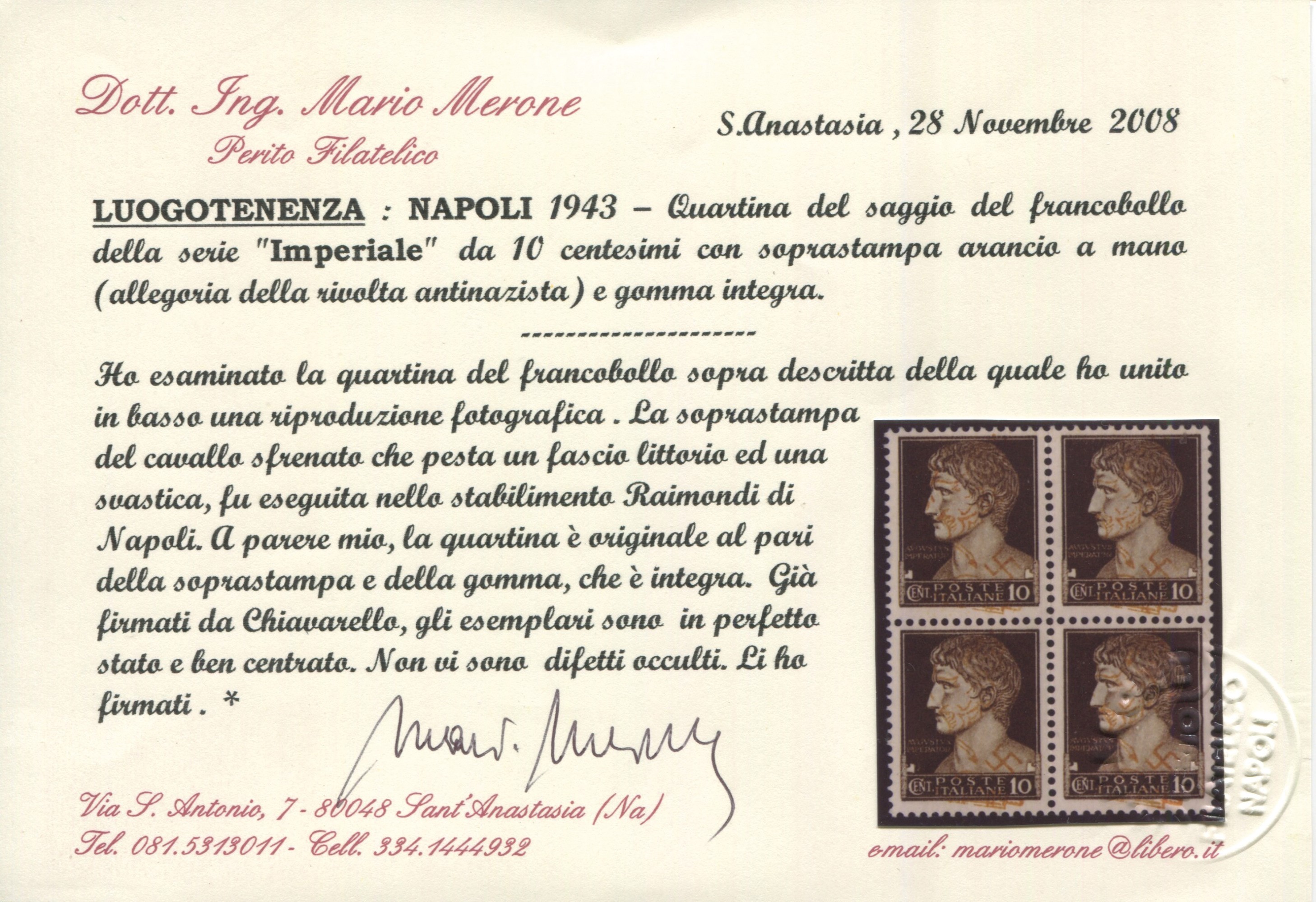 1943 - Luogotenenza - Napoli - Saggio serie “Imperiale” 10c. Soprastampa arancio a mano effettuata presso la Tipografia [..]