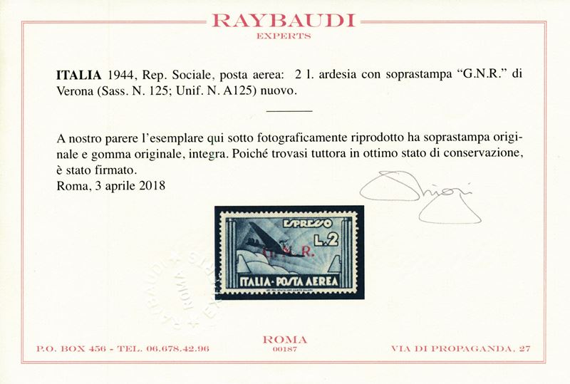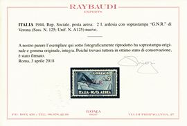 1944 – Repubblica Sociale Italiana – Posta Aerea - Emissione della “Guardia Nazionale Repubblicana” con soprastampa G.N.R. di Verona – Espresso Aereo 2 lire ardesia (Sass. 125).