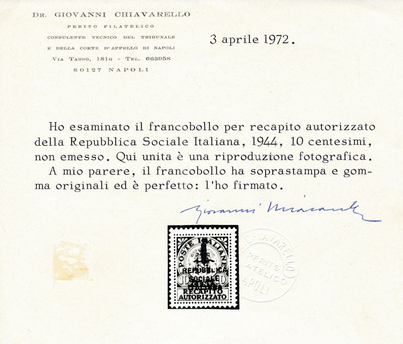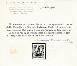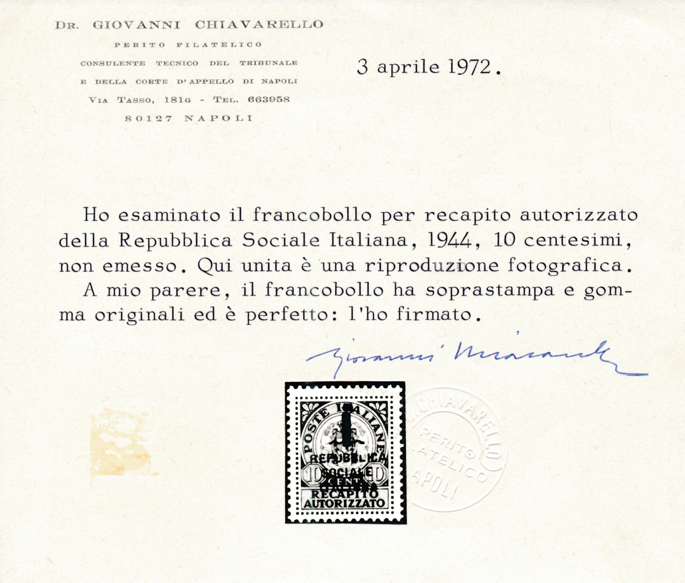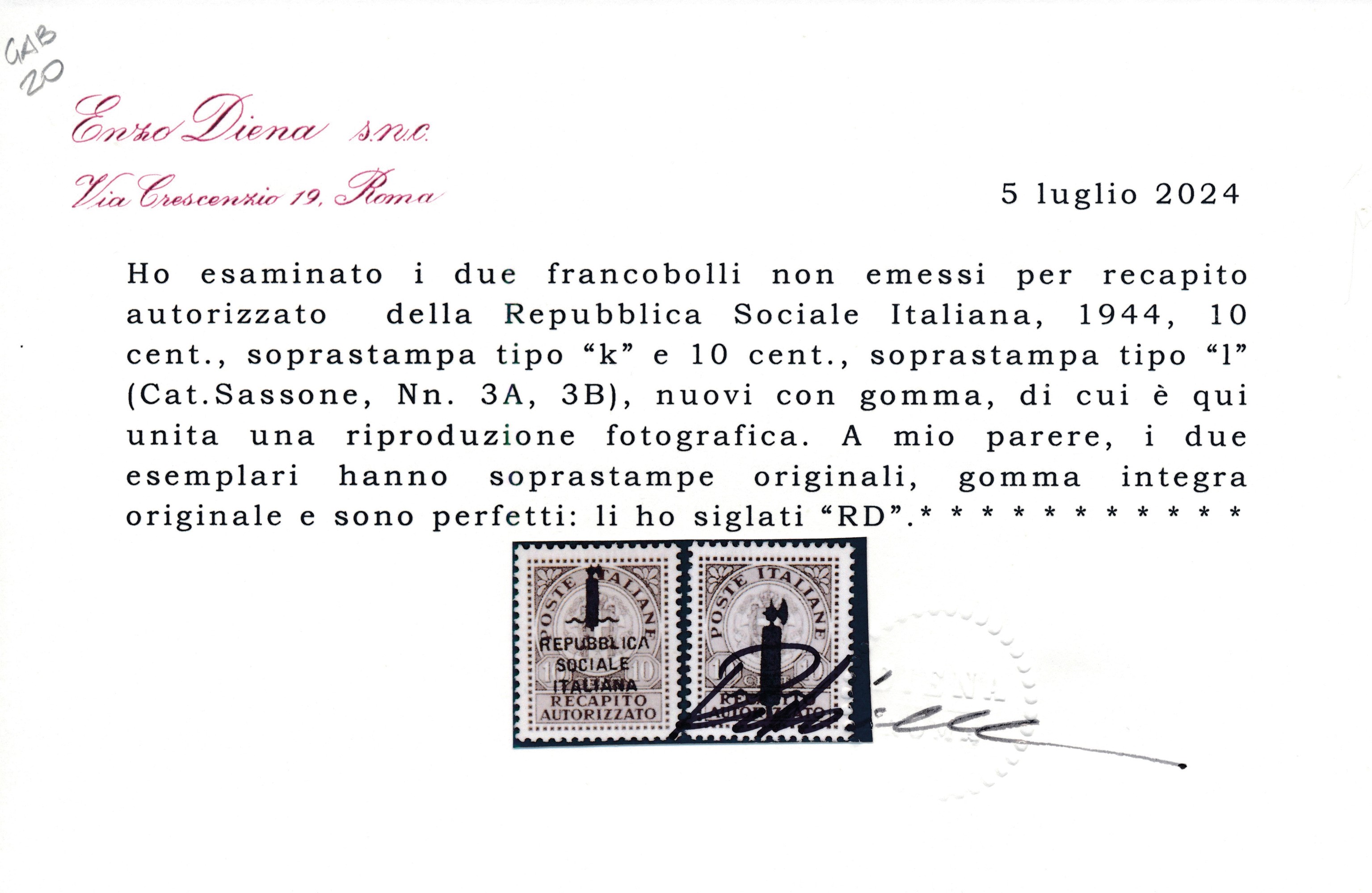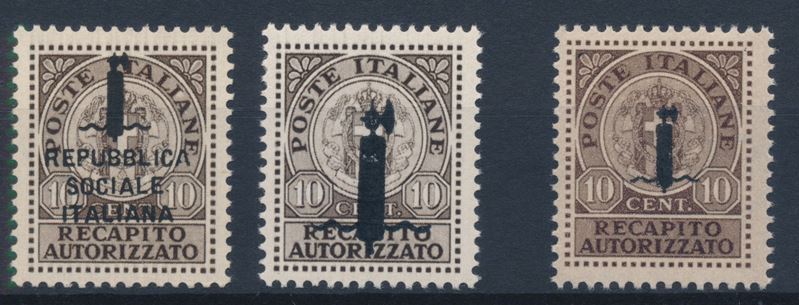 1944 – Repubblica Sociale Italiana – Recapito Autorizzato – I due non emessi ed il valore emesso (Sass. 3A, 3B e 4).